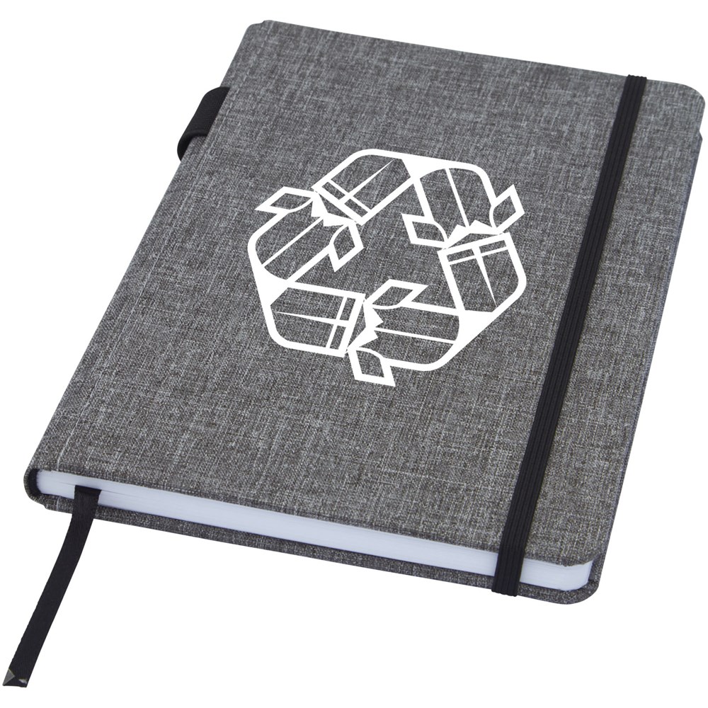 Notitieboek in A5 formaat met cover gemaakt van RPET-stof. Bevat 96 vellen 70 g/m² gerecycled papier met gelijnde lay-out, een penlus en lint. Verpakt in een kartonnen hoes.