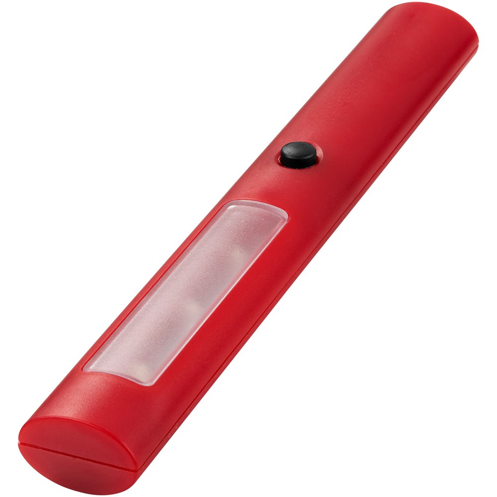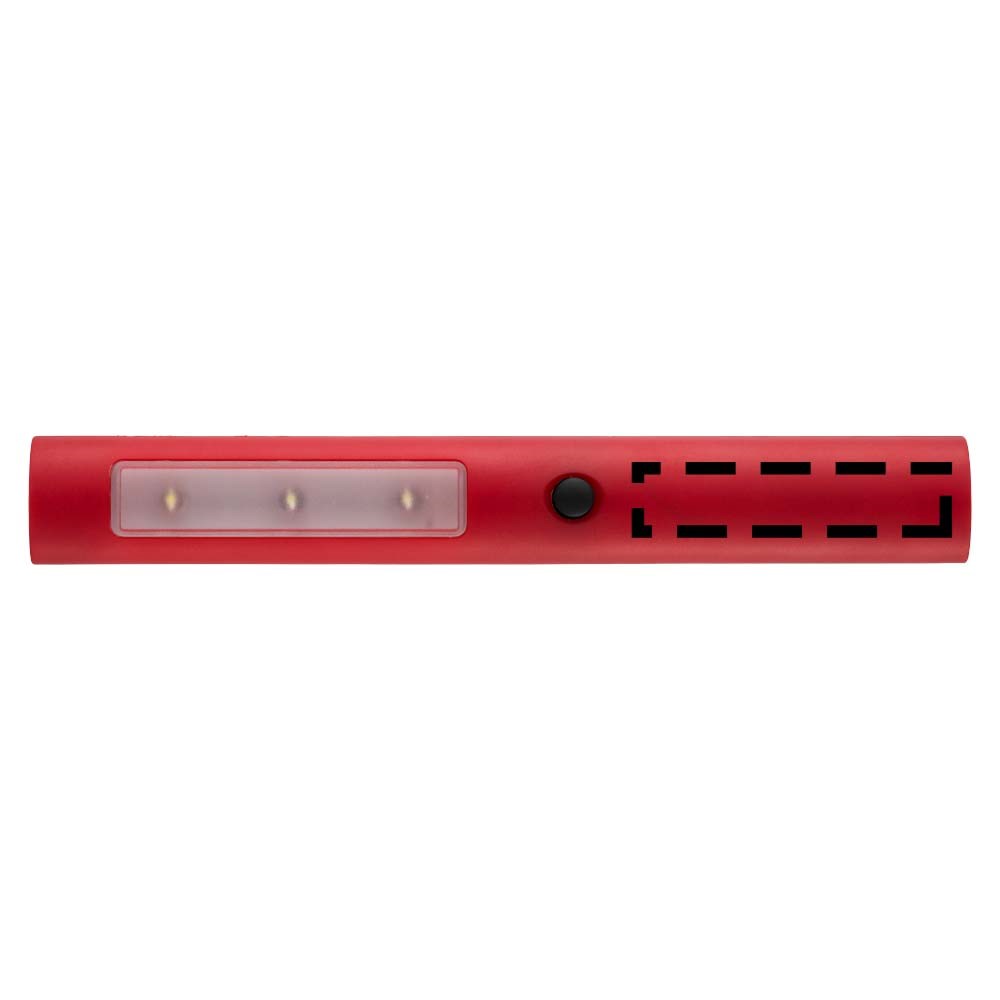 Zaklamp met drievoudig helder LED licht en twee standen: normaal en knipperlicht. Aan-/uit-schakelaar op de voorzijde, tweedelige magneet aan de achterkant. Inclusief batterijen.