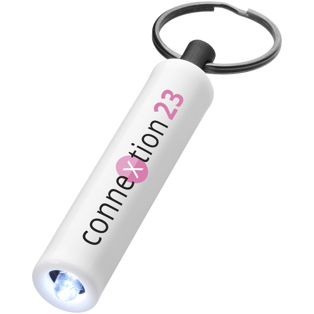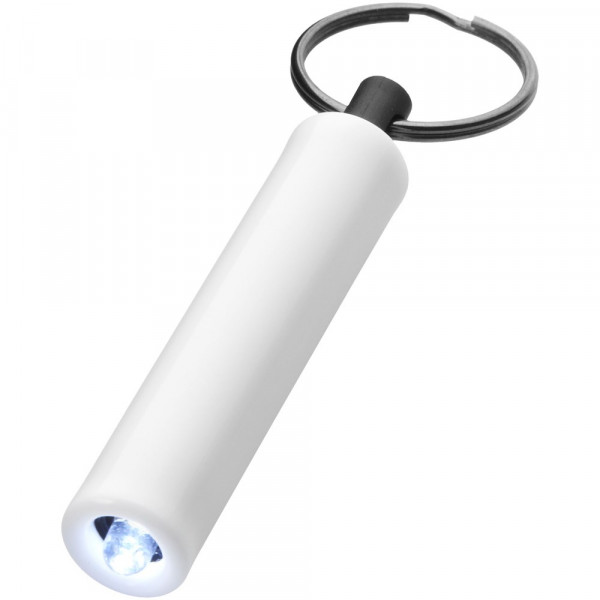 Sleutelhanger met enkelvoudig wit LED-licht. Metalen sleutelring. drukknop aan de achterkant. Inclusief batterij.