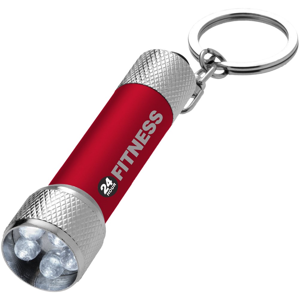 Sleutelhangerlampje met 5 helder witte LED's en aan-/uitknop. Metalen sleutelring. Inclusief batterijen.