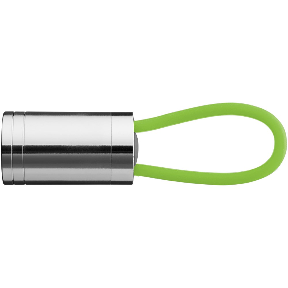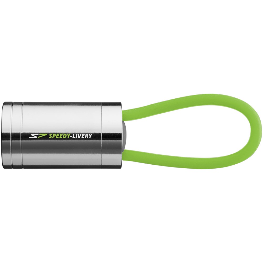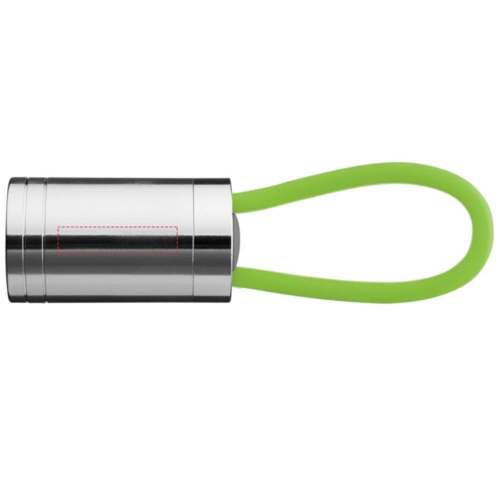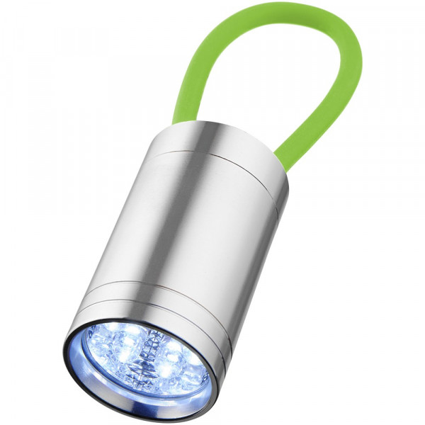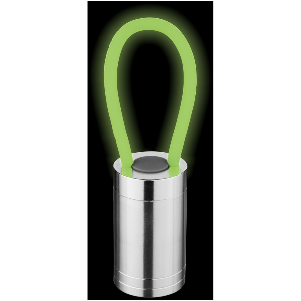 Zaklamp met 6 witte leds en bijpassend glow in the dark siliconen bandje en aan/uit knop op de achterkant. Batterijen inbegrepen.