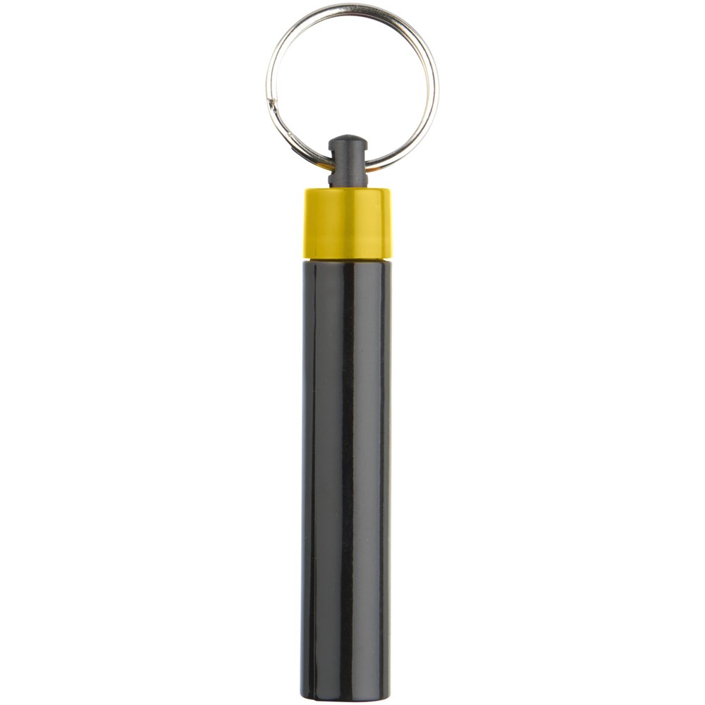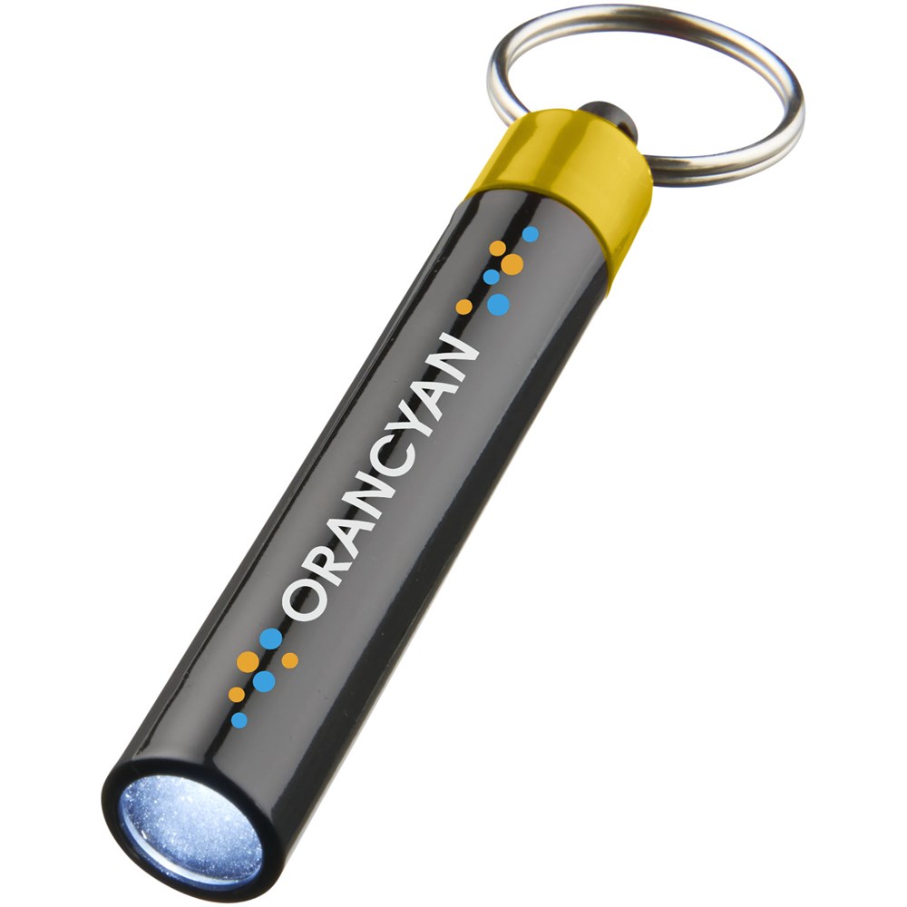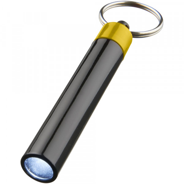Retro premium LED sleutelhangerlampje. Sleutelhanger UV-gecoat met enkel wit LED-lampje dat wordt geregeld door een drukknopschakelaar. Metalen split sleutelring. Inclusief batterijen. ABS kunststof.