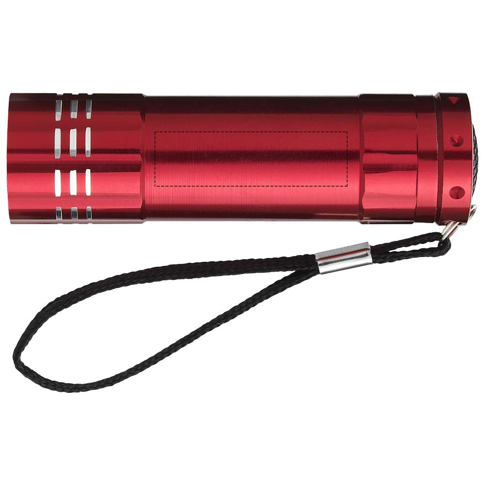 Stijlvolle zaklamp met 9 heldere LEDs. Polsriempje, aan-/uit-drukknop aan de achterkant. Werkt op 3 AAA-batterijen.