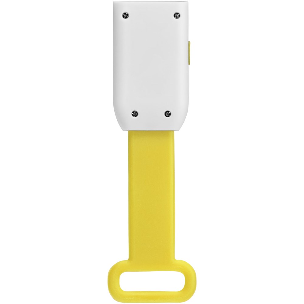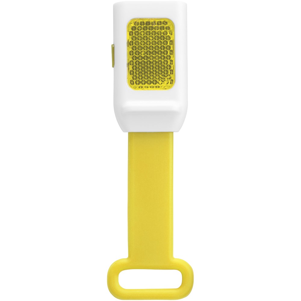 Reflectorlamp voor buitenshuis. Drie LEDs voor constant licht en één LED voor knipperlicht. Met flexibele siliconenband voor eenvoudige bevestiging aan fiets of tas. Inclusief batterij.