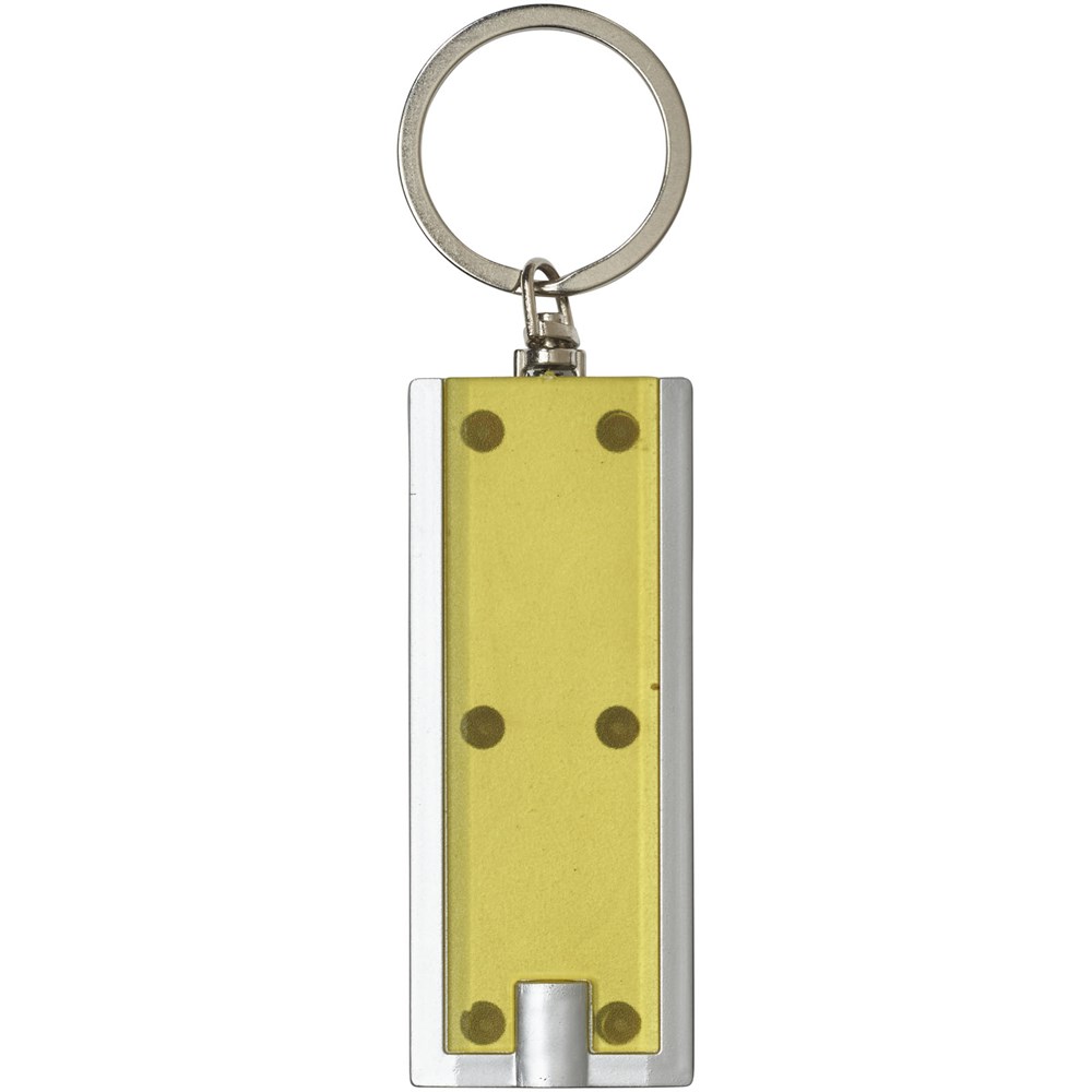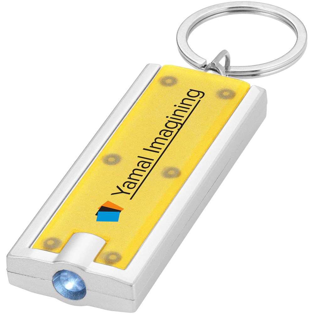 Sleutelhanger met helder wit LED-lampje met drukknop. Metalen sleutelring. Inclusief batterijen.