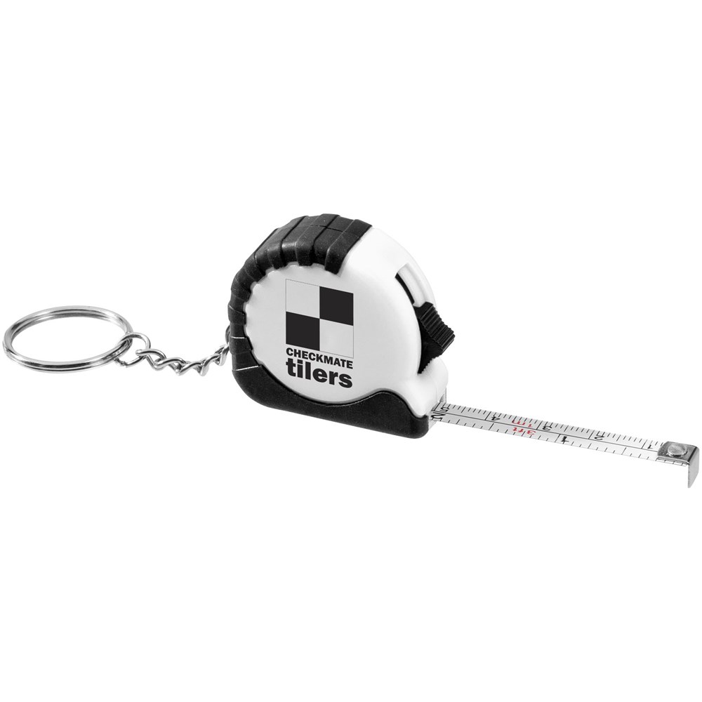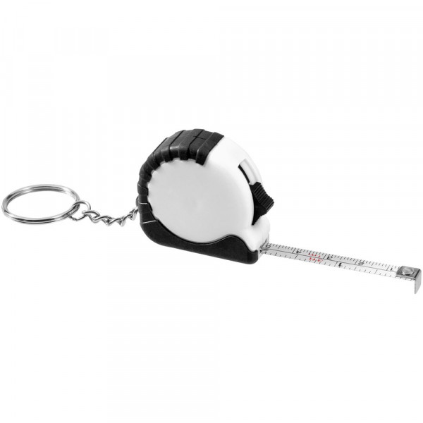 Rolmaat van 1 meter met vergrendeling en verdeling in centimeters en inches. Vergrendelingsknop op de zijkant. Rubberen greep. Metalen sleutelhanger. Niet geschikt voor professioneel gebruik en geijkte toepassingen.