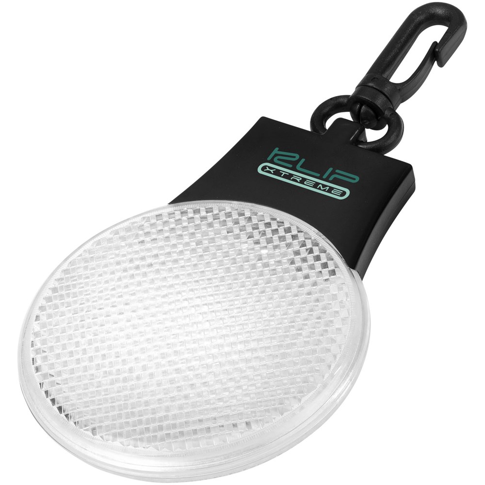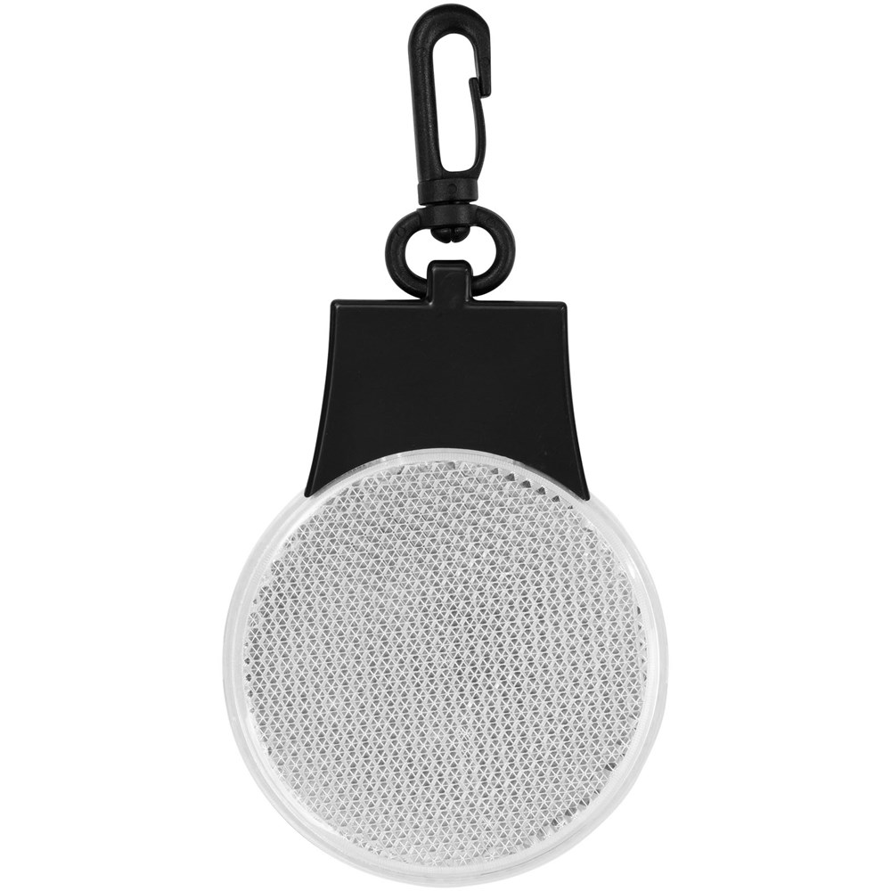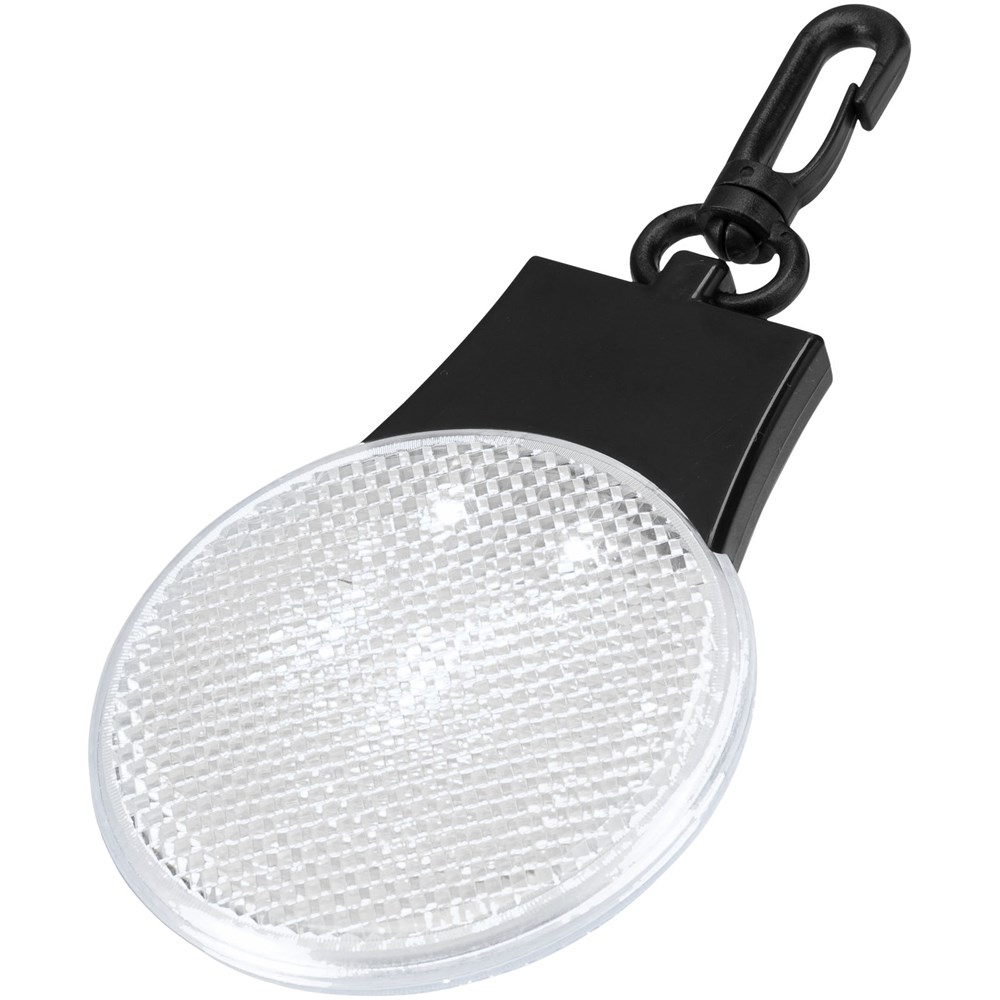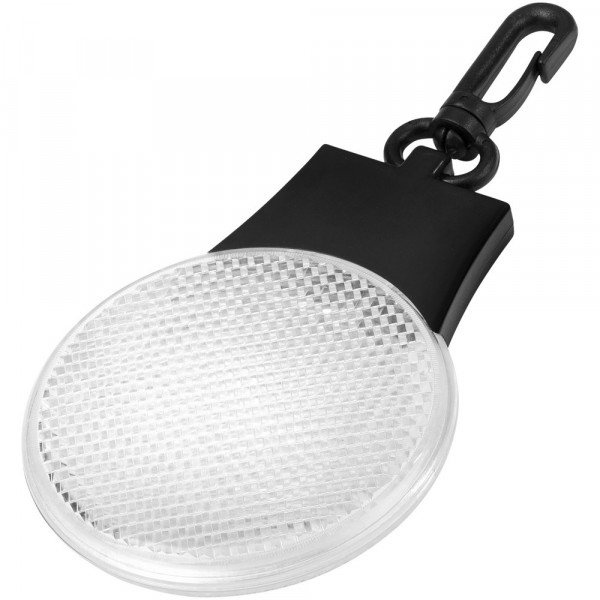 Reflectorlamp met drie LED lichtstanden – constant, knipperend en flitsend van links naar rechts. Met aan-/uitknop en functieschakelaar op de achterkant. Kunststof clip. Inclusief batterijen.