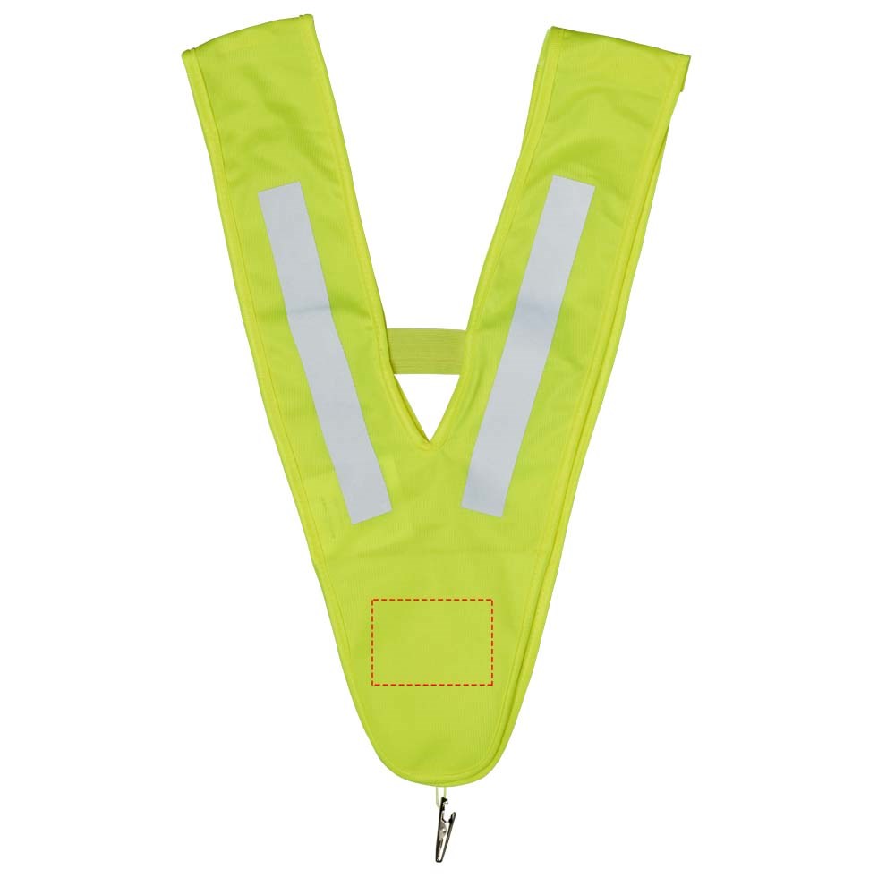 V-vormig uniseks reflecterend veiligheidsvest dat gemakkelijk te dragen is voor zowel voetgangers en fietsers. Klittenbandsluiting op de schouder voor extra veiligheid, waardoor het ook gemakkelijk aan te trekken is, en de sterke bevestigingsclip zorgt ervoor dat het vest stevig aan de kleding vastzit. De elastische band aan de voor- en achterkant maakt het rekbaar en gemakkelijk te dragen over dikke jassen. Wordt geleverd met een zak voor het opbergen van kleine voorwerpen, en een identificatielabel dat kan worden gebruikt om dit vest te personaliseren. Getest en gecertificeerd volgens EN13356:2001 Type 2 regelgeving. Volgt de PBM-richtlijnen over de toepassing van Verordening (EU) 2016/425 Persoonlijke beschermingsmiddelen categorie II.