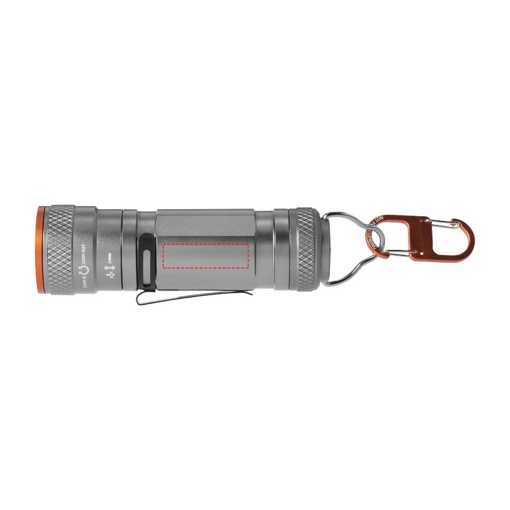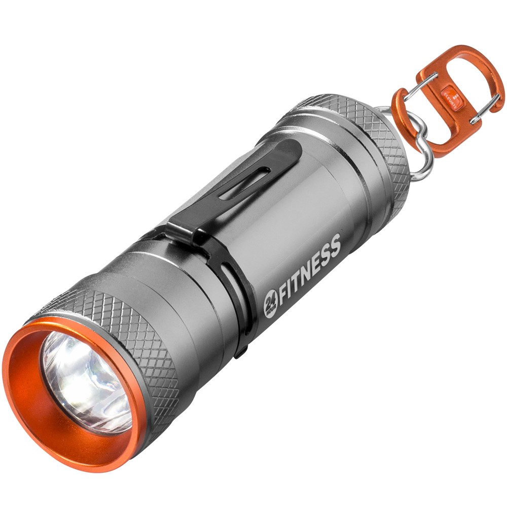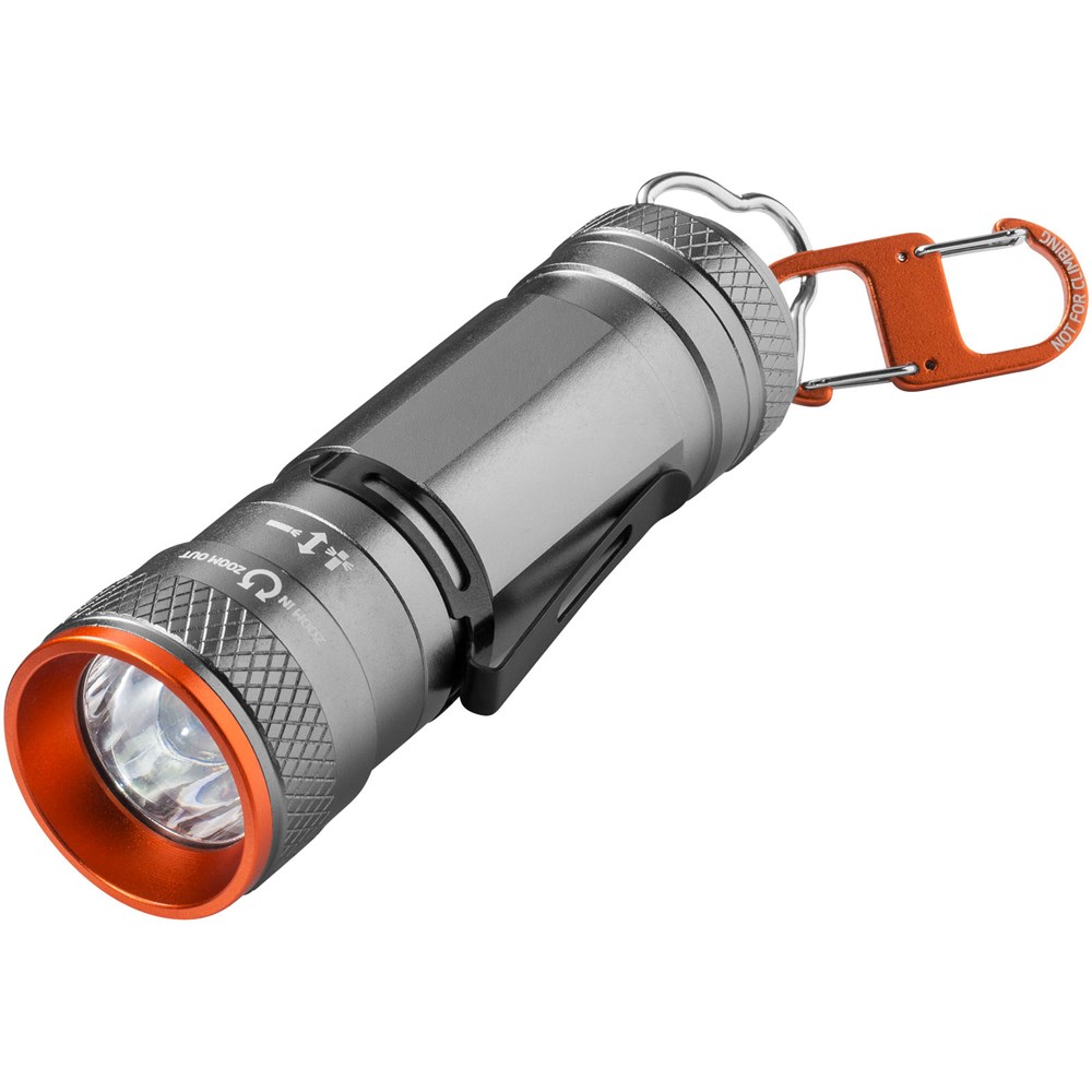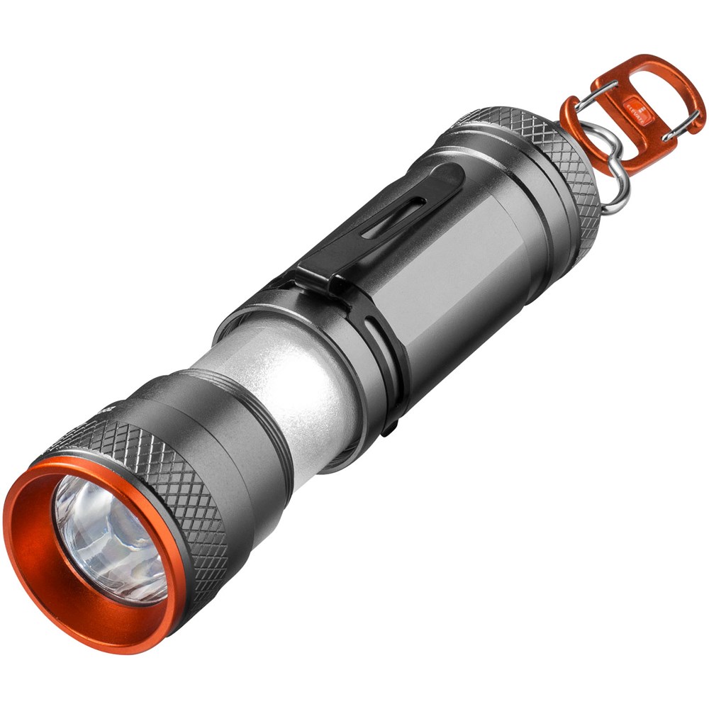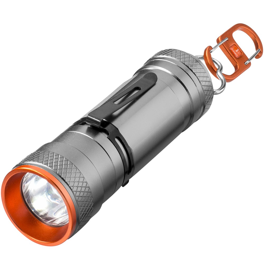 Gecombineerde lamp/zaklantaarn met superheldere 3W CREE LED en 4 lichtstanden plus zoomfunctie. Te gebruiken als staande lamp en, met de exclusief ontworpen dubbele karabijnhaak, als hanglamp. Uitneembare metalen veer die zowel aan de voor- als aan de achterkant kan worden geplaatst. Met beknopte handleiding in 6 talen, waaronder Nederlands. Inclusief batterijen. Geleverd in een Elevate geschenkverpakking. Exclusief ontwerp.