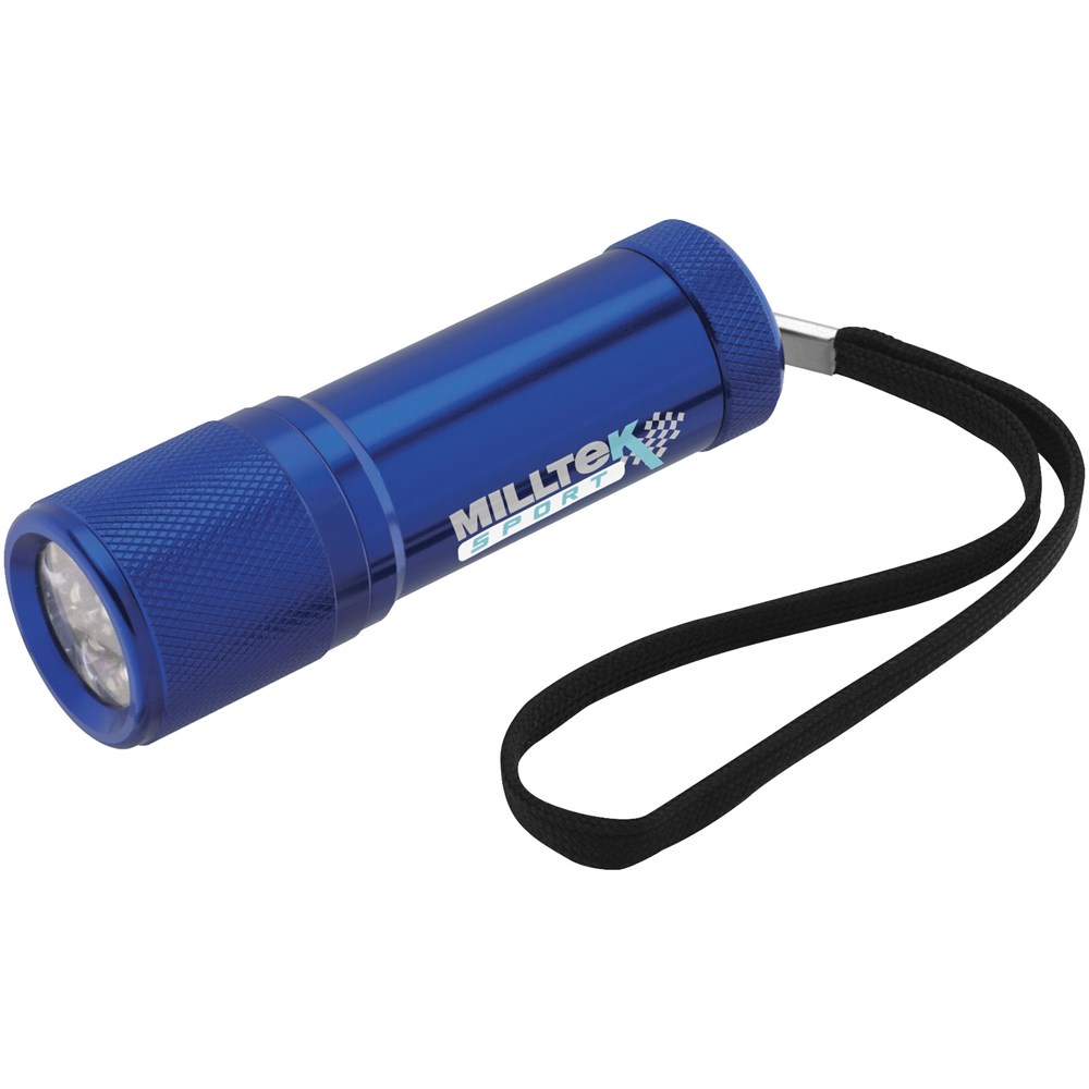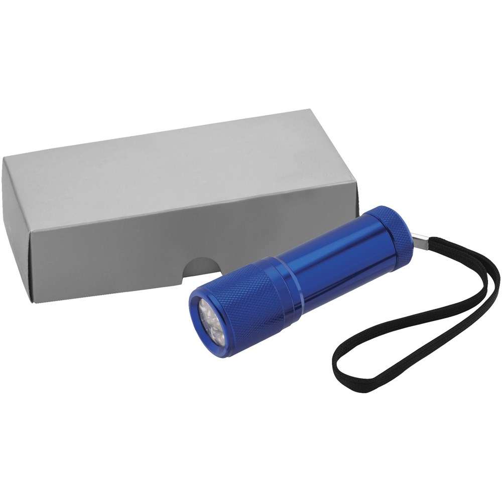 Zaklamp met 9 witte LED's. Drukknop voor aan/uit en polsriempje. Geleverd in een geschenkverpakking met EVA voering. Inclusief 3 AAA-batterijen.