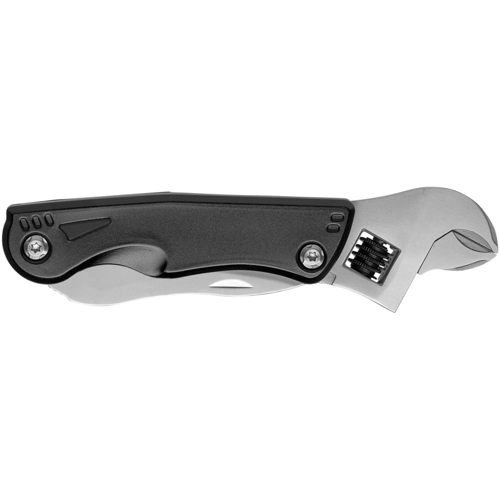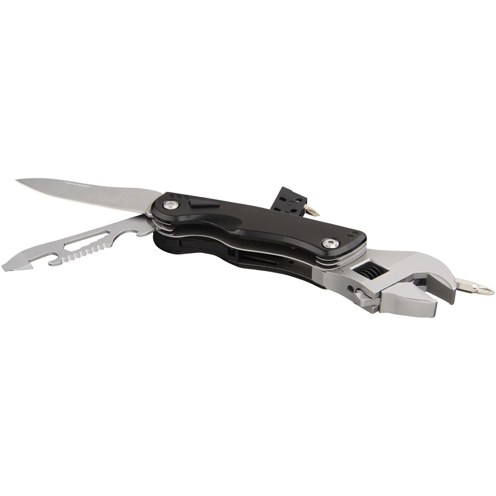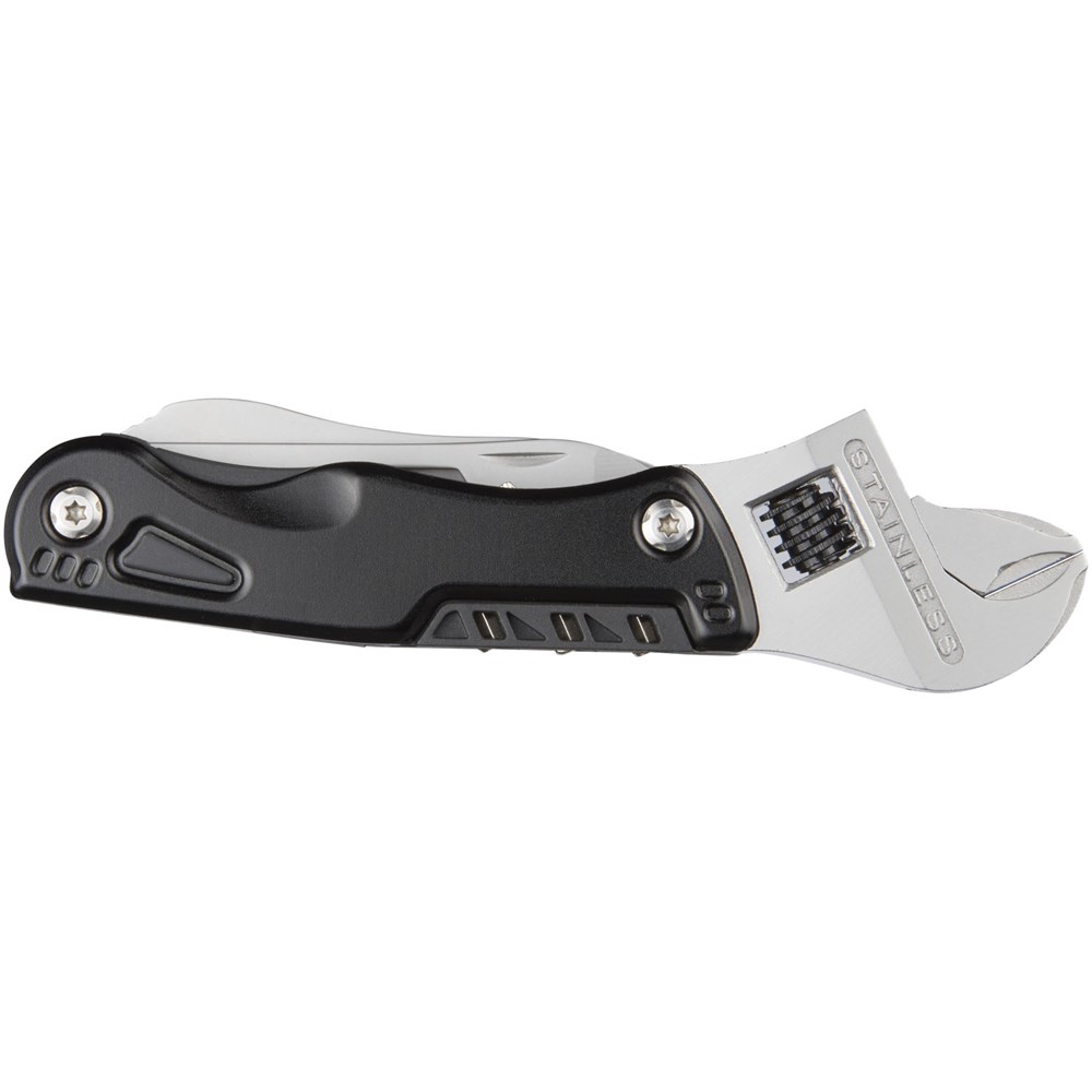 Multitool met verstelbare moersleutel en LED lichtje in een compact design. Ideaal voor snelle reparaties. Schroevedraaier met 3 bits, mes, zaag, fles- en blikopener. Geleverd in een STAC geschenkverpakking.