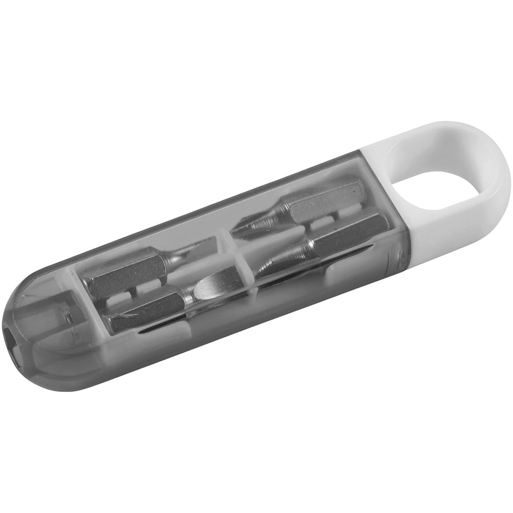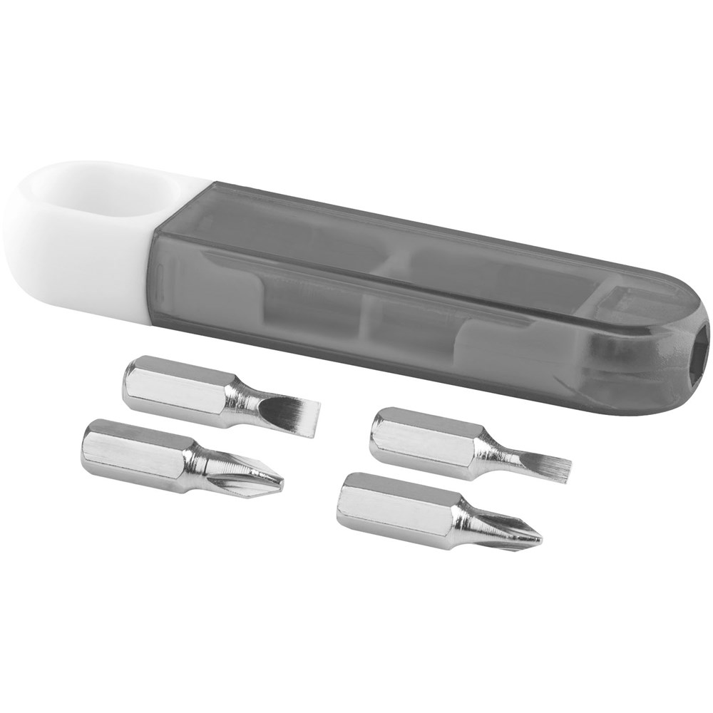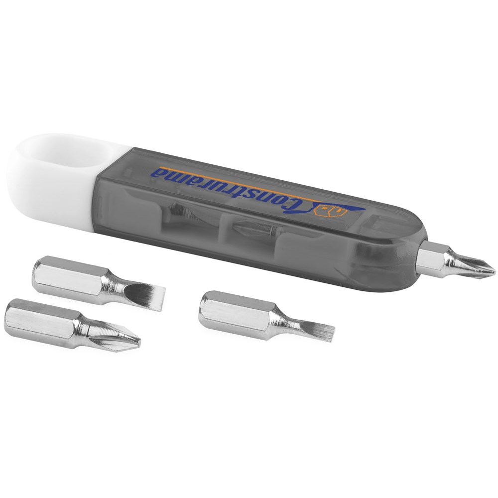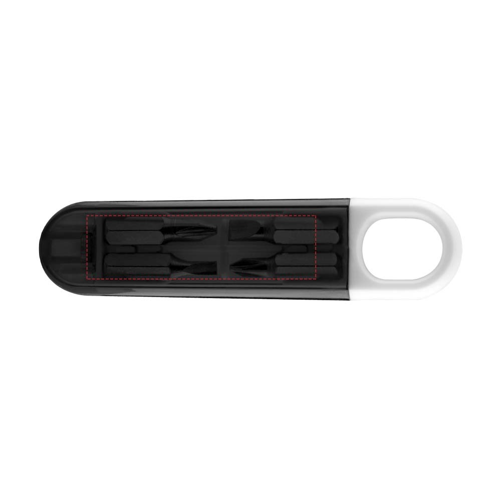 Uitschuifcompartiment met 2 formaten platte bits en 2 formaten kruiskopbits. Magnetische onderzijde houdt bits tijdens gebruik op hun plaats.