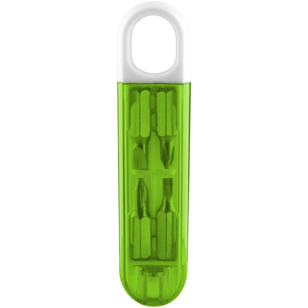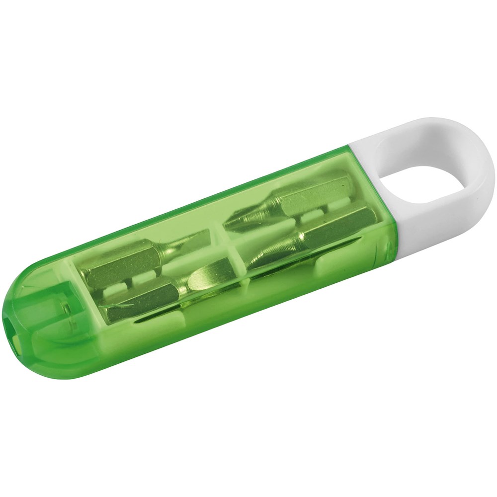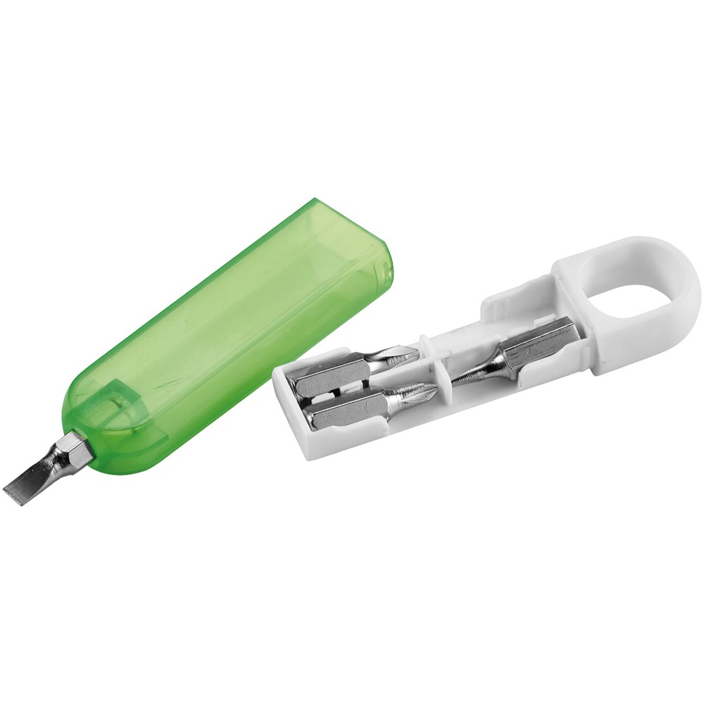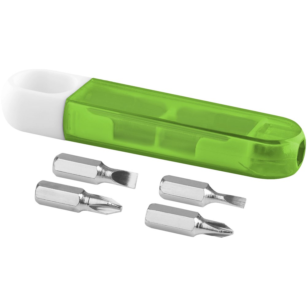 Uitschuifcompartiment met 2 formaten platte bits en 2 formaten kruiskopbits. Magnetische onderzijde houdt bits tijdens gebruik op hun plaats.