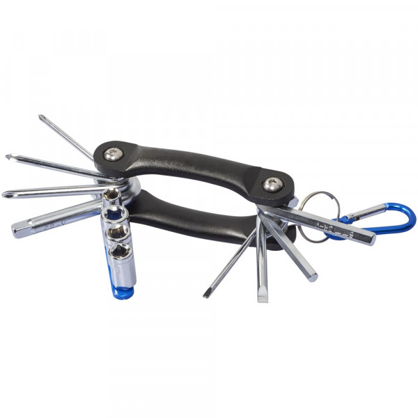 12 delige multi tool met 3 soorten Philips, 2 soorten vlakke en 2 soorten hex-sleutel schroevendraaierkoppen in koolstofstaal met chroomafwerking. Inclusief gekleurde adapter met 4 houders en bijpassende karabijnhaak die niet bedoeld is om te klimmen.