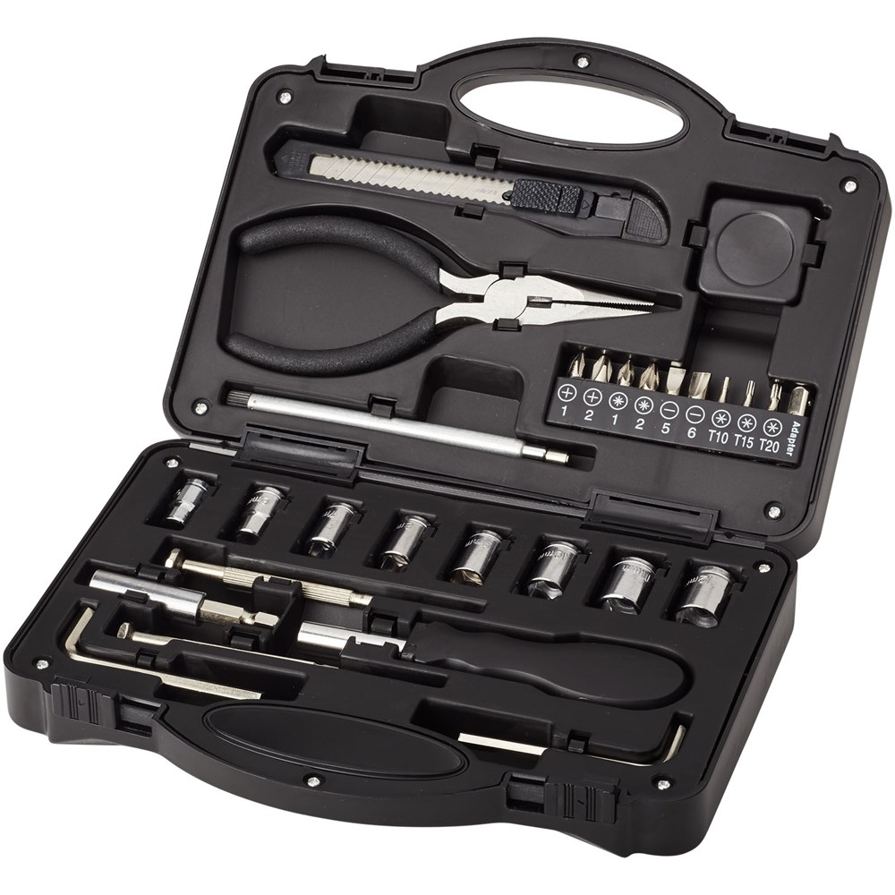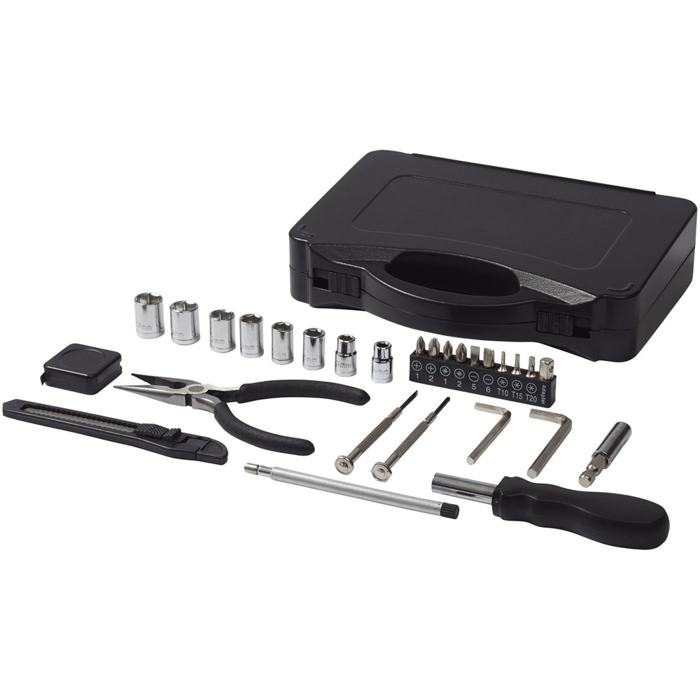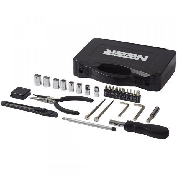 Deze 28 delige gereedschapsset bevat een schroevendraaierhandgreep met 9 schroevendraaierbouten (PH1, PH2, PZ1, PZ2, SL5, SL6, T10, T15, T20), een verlengingsadapter, een adapterhouder, 8 houders (5mm, 6mm , 7mm, 8mm, 9mm, 10mm, 11mm, 12mm), een uitneembaar gereedschapsmes, een lange neusplier, een telescopisch magnetisch ophalen gereedschap, 2 zeskant sleutels (4mm, 5mm), 2 precisie schroevendraaiers (PH2, SL2) en een meetlint. Geleverd in een STAC geschenkverpakking.