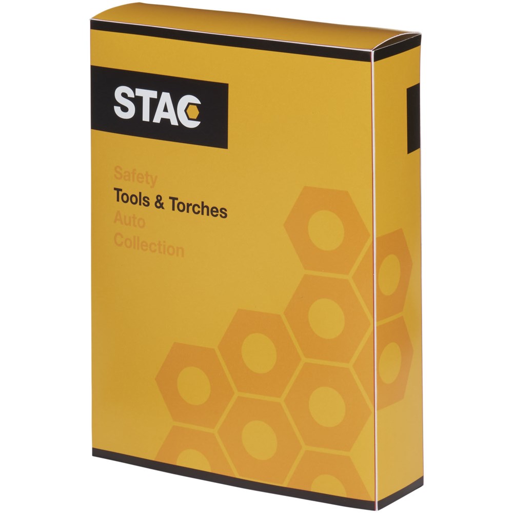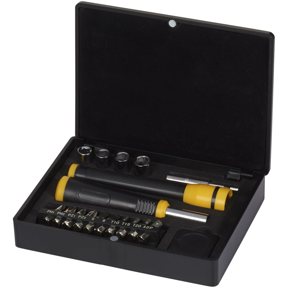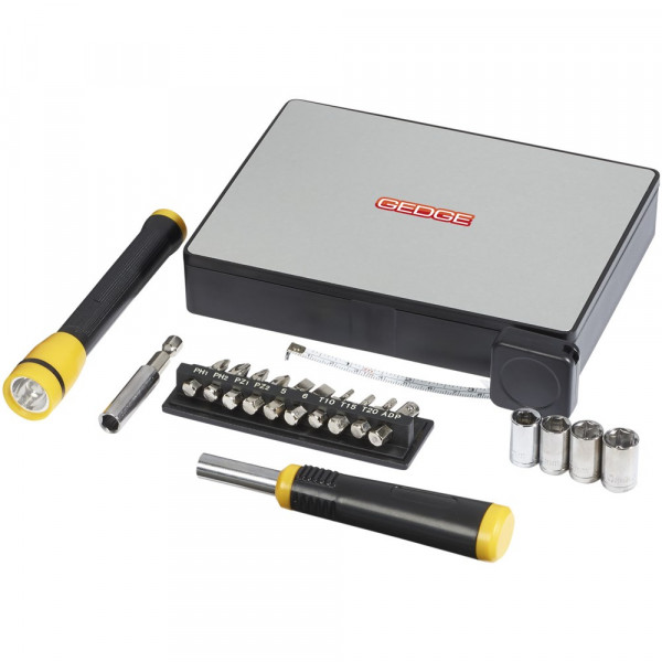 Gereedschapskist met EVA binnenlaag en deksel met magnetische sluiting en een enkele witte LED zaklamp, 1 m rolmaat, schroevendraaier handgreep met magnetische verlengingsstaaf, 4 dopsleutels (7/8/9/10) en bithouder met 9 bits (PH, PZ, plat en torx) en adapter voor dopsleutel.