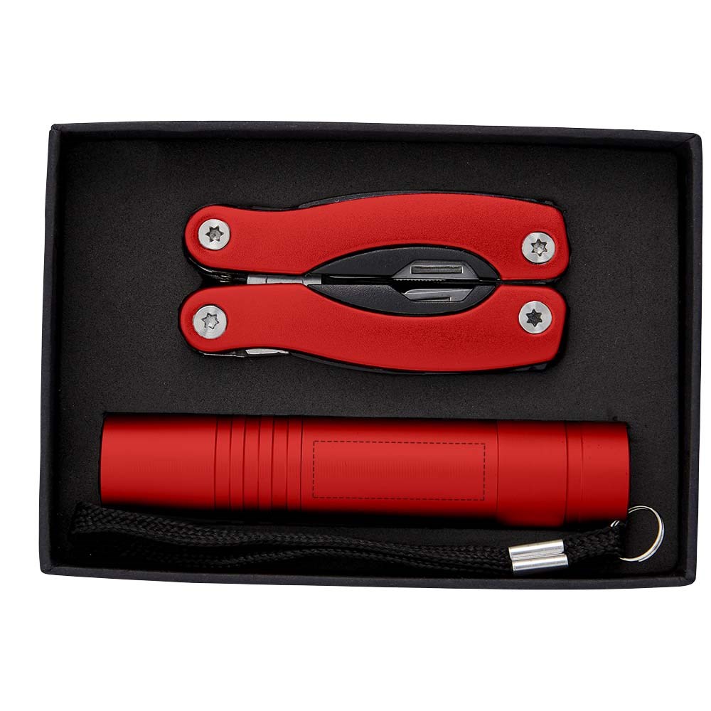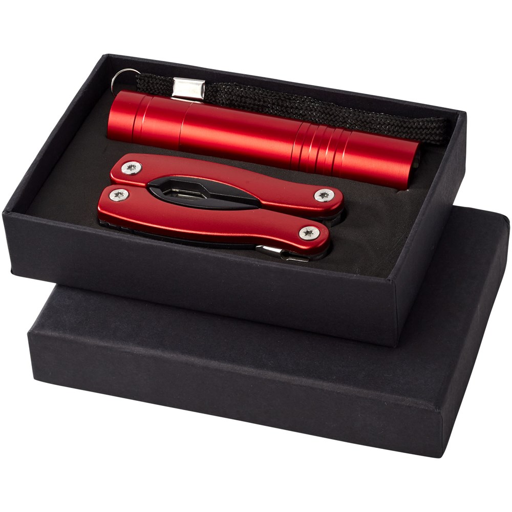 11 delige mini multi tool met LED zaklamp. Inclusief batterijen. Geleverd in een zwarte geschenkverpakking.