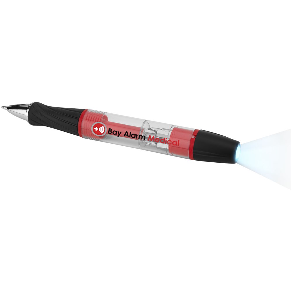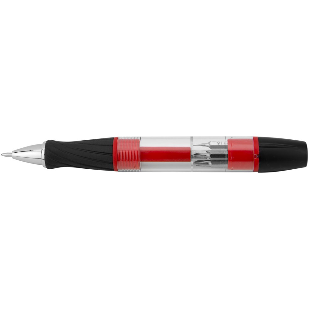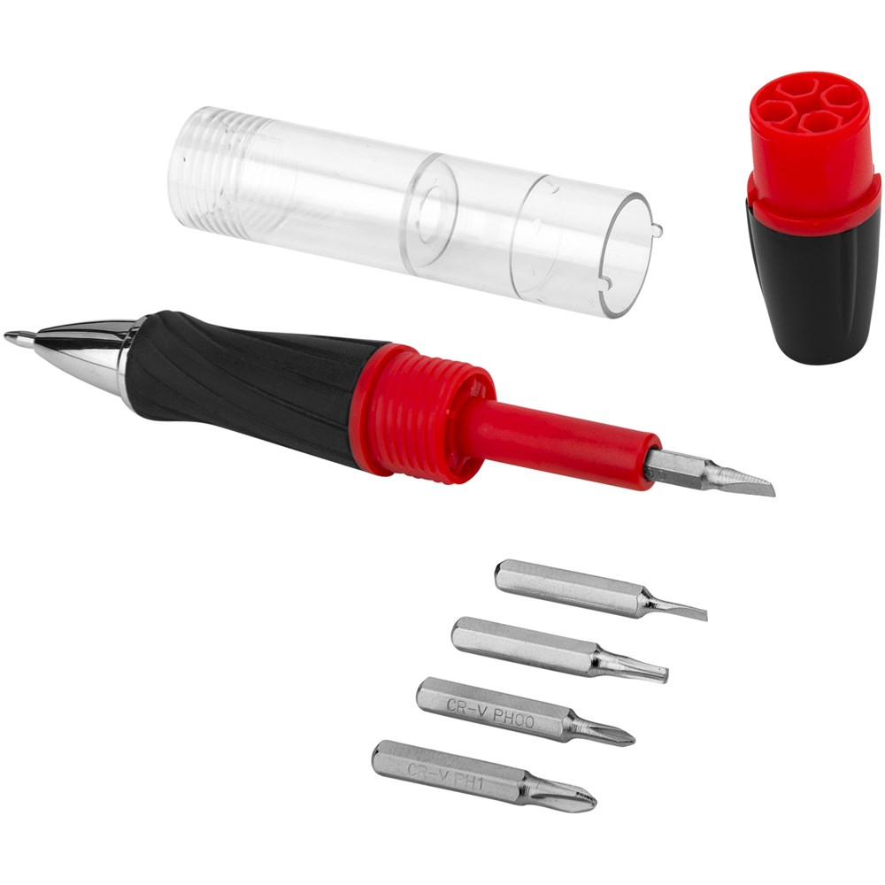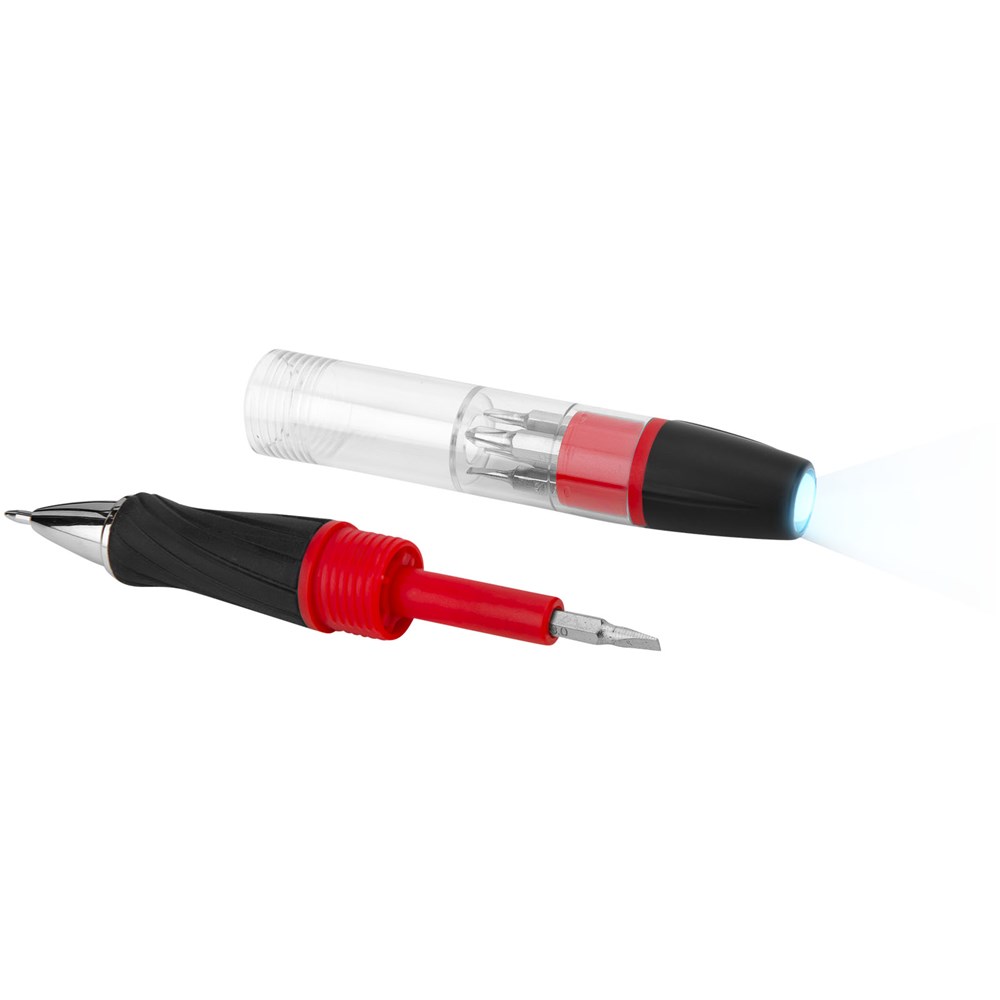 Balpen met draaimechanisme in de punt. Schroef het lichaam met magnetische bit-houder open om toegang te hebben tot de 5 bits en ze te kunnen wisselen. Draai de LED aan de bovenzijde om aan/uit te zetten. Inclusief batterijen.