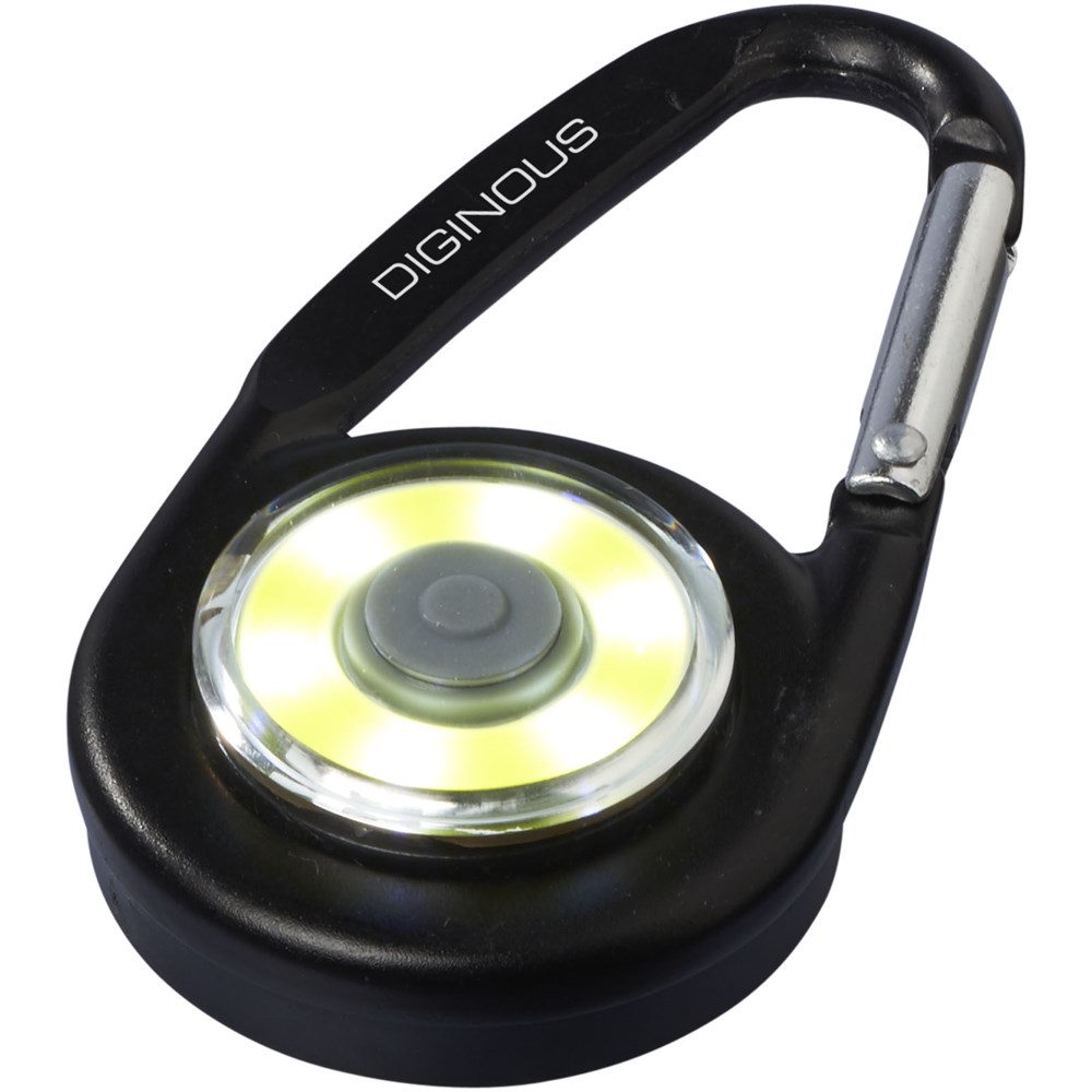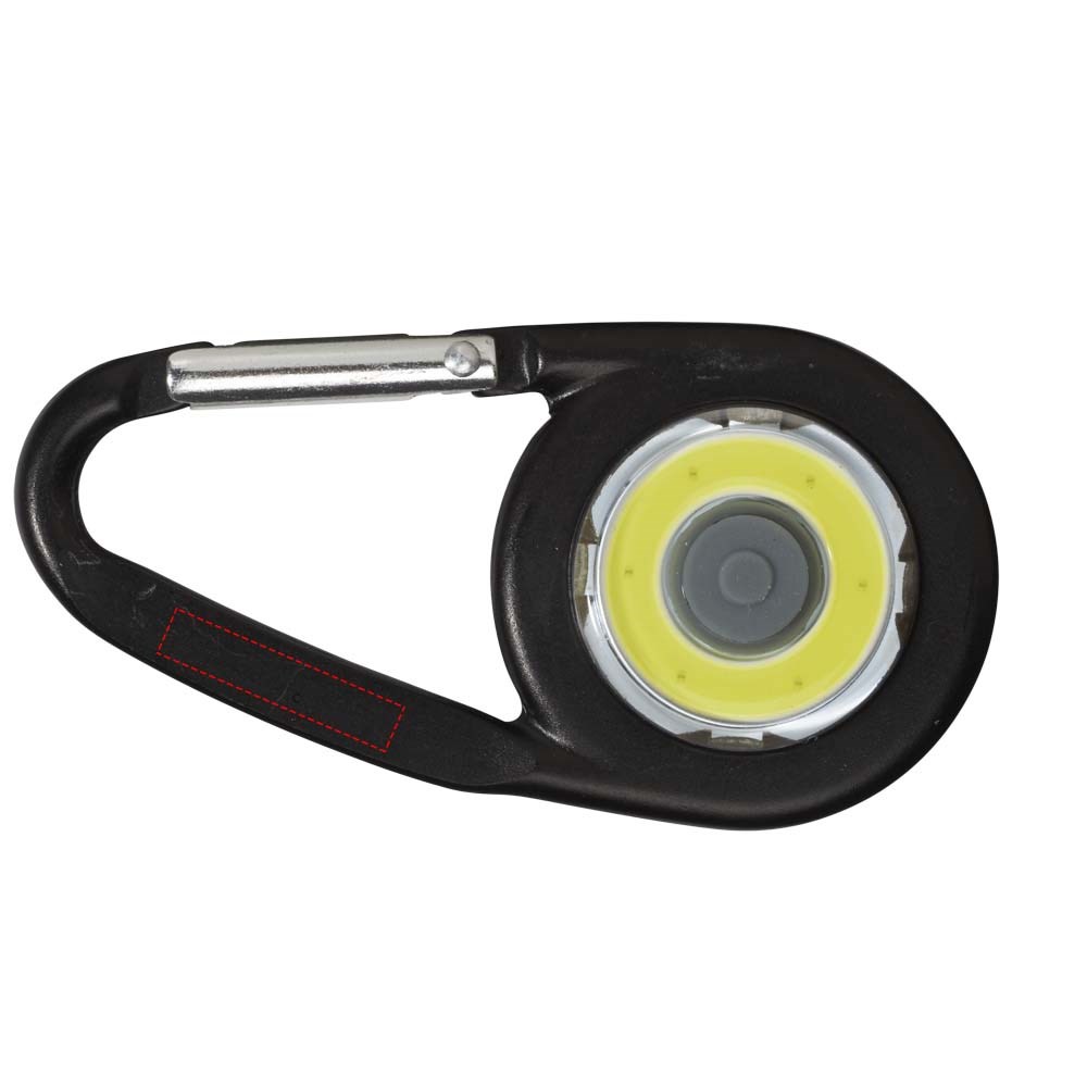 Karabijnhaak met COB LED licht. Aan / uit-drukknop voor hard, zacht en knipperend licht. Platte achterkant ideaal voor decoratie. Niet te gebruiken voor klimmen. Inclusief batterijen.