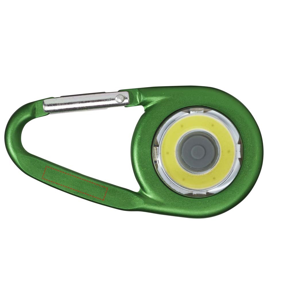 Karabijnhaak met COB LED licht. Aan / uit-drukknop voor hard, zacht en knipperend licht. Platte achterkant ideaal voor decoratie. Niet te gebruiken voor klimmen. Inclusief batterijen.