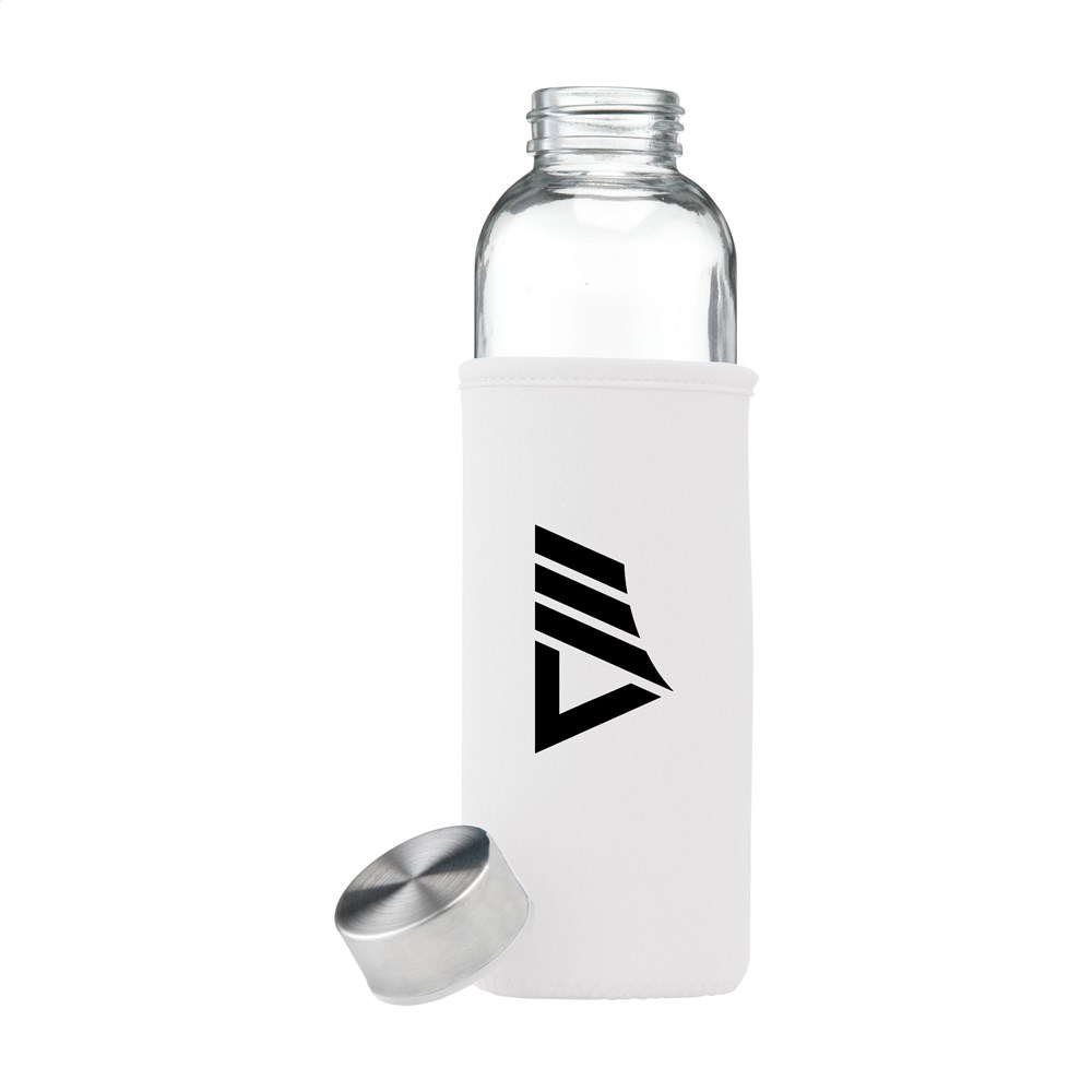 Slanke, milieuvriendelijke en lekvrije waterfles van duurzaam sodalime-glas met RVS schroefdop. Met neopreen sleeve voor het comfortabel dragen van de fles. Inhoud 500 ml. Per stuk in doos.