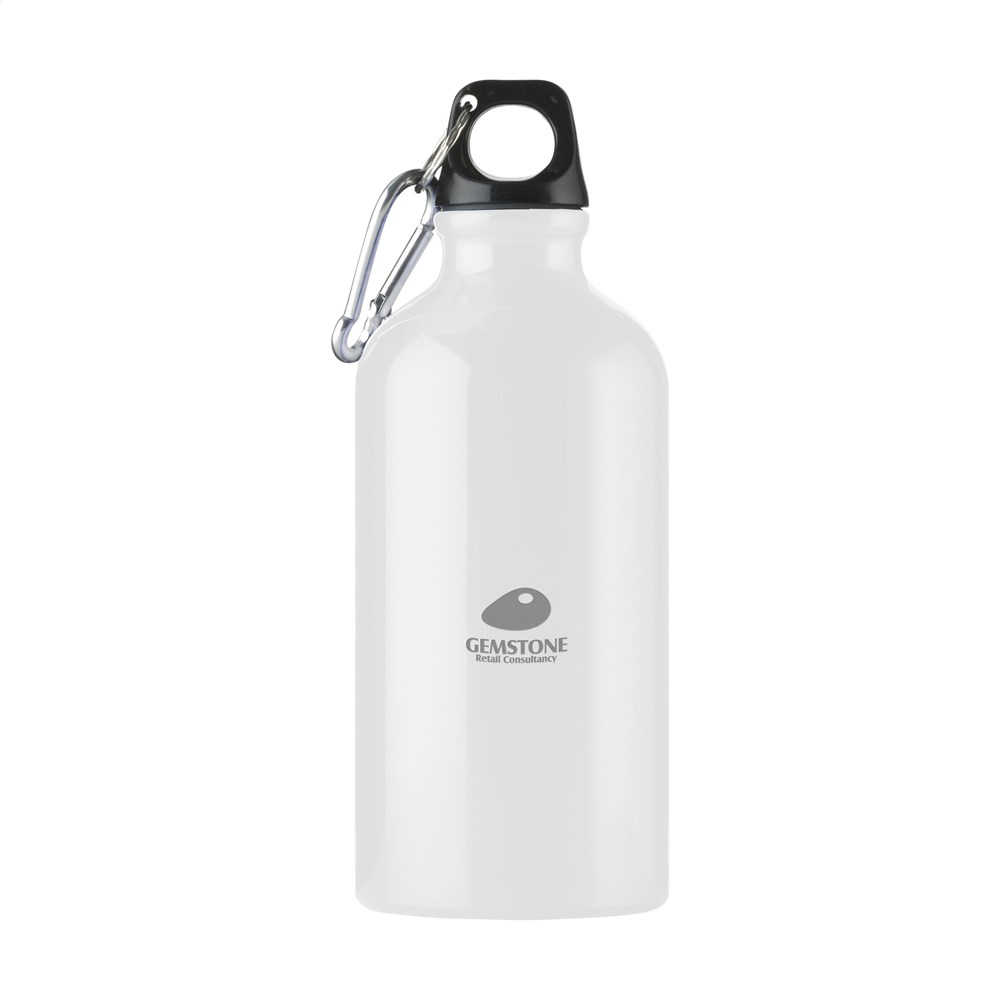 Enkelwandige, aluminium waterfles met hoogglans finish, kunststof schroefdop met sleutelring en metalen karabijnhaak. De karabijnhaak is niet geschikt als klimgereedschap. Lekvrij. Inhoud 500 ml.