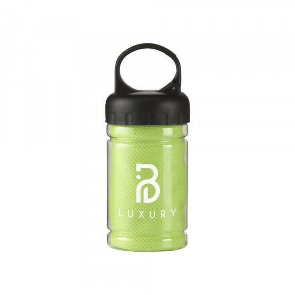 Speciale koelhanddoek van 100% polyester. Na een dompeling in koud water biedt deze handdoek verkoeling tijdens sportieve activiteiten of bij zonnebrand. Ideaal formaat (afm. 30 x 80 cm) om te dragen als nekkoeler. In transparante koker met ABS schroefdeksel met karabijnhaak.