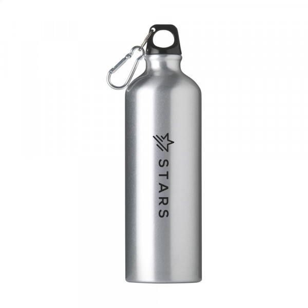 Enkelwandige, aluminium waterfles met hoogglans finish, kunststof schroefdop met sleutelring en metalen karabijnhaak. De karabijnhaak is niet geschikt als klimgereedschap. Lekvrij. Inhoud 750 ml.