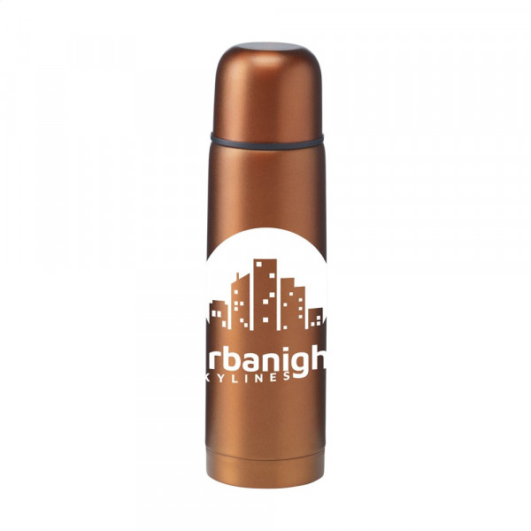 Dubbelwandige, vacuüm geïsoleerde, RVS thermosfles met dubbele schroefdop en een handig schenksysteem met druksluiting. De dop is ook als drinkbeker te gebruiken. Afgewerkt met frosted, metallic finish. Inhoud 500 ml. Per stuk in doos.