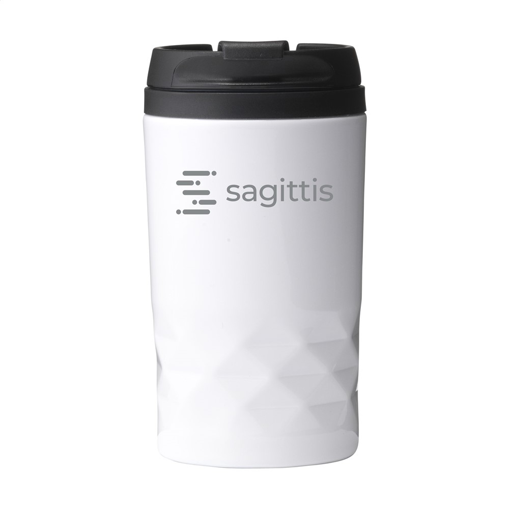 Dubbelwandige, lekvrije RVS thermosbeker met schroefdeksel en klikopening en PP binnenwand. Met opvallend 3D-geometrisch diamantpatroon in de houder. Slipvaste onderzijde. Inhoud 250 ml. Per stuk in doos.