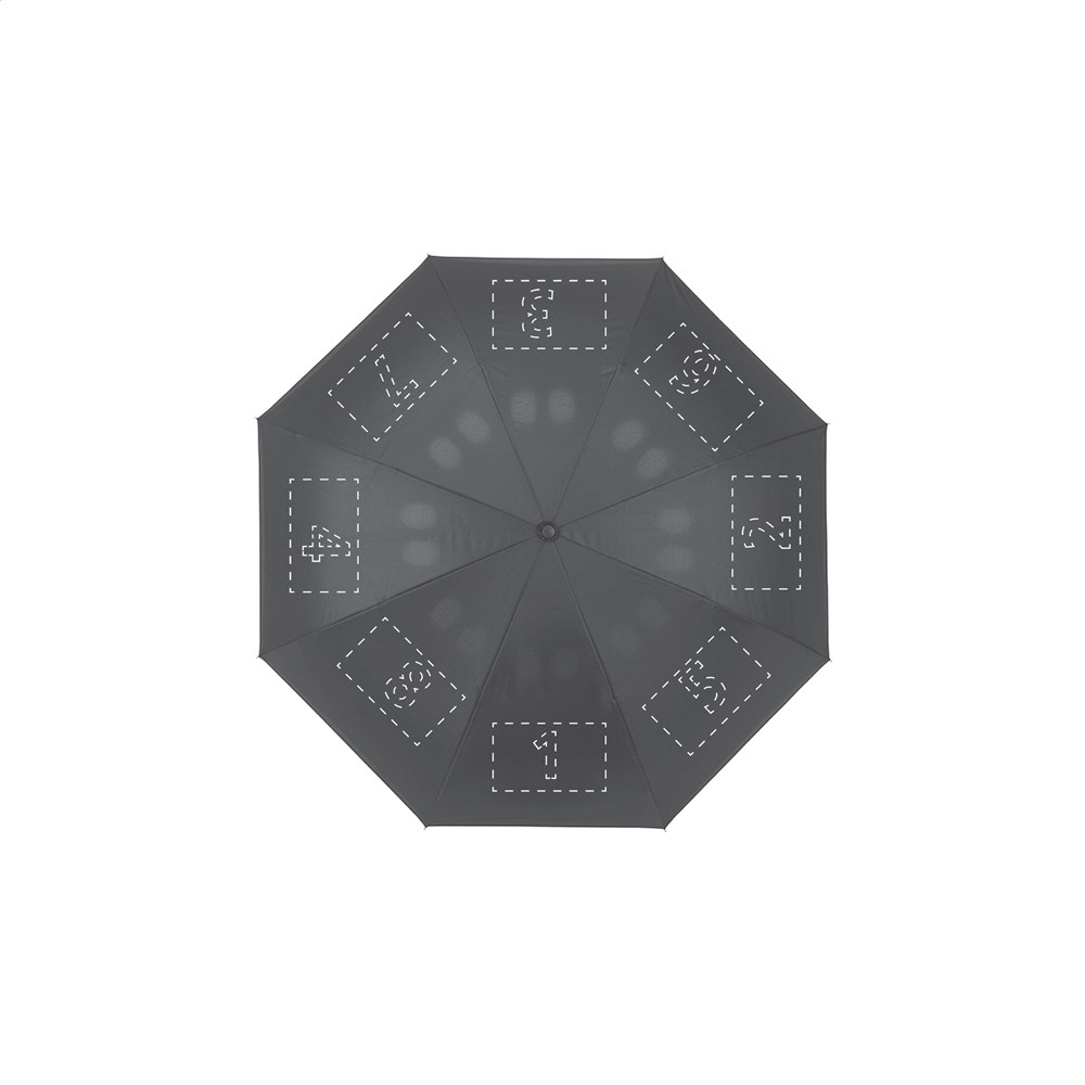 Grote, innovatieve omgekeerde paraplu met dubbele 190T pongee bespanning. Speciaal materiaal dat drogen versnelt. Kan staand drogen. Sluit automatisch, opent handmatig. Ideaal tijdens het in- en uitstappen van de auto. Metalen frame met windproof systeem en ergonomisch gevormde handgreep met draaglus.