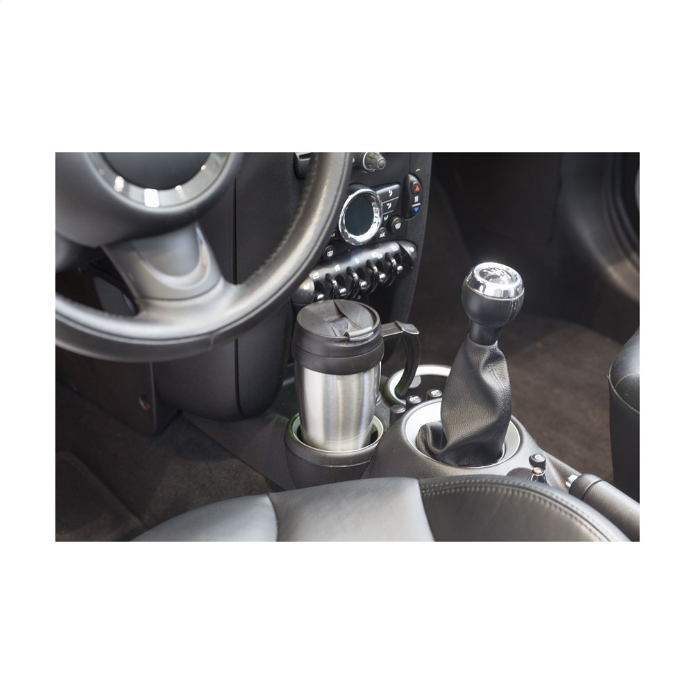 Dubbelwandige RVS/kunststof thermosbeker met schroefdeksel en klikopening. Lekvrij. Inhoud 400 ml. Per stuk in doos.