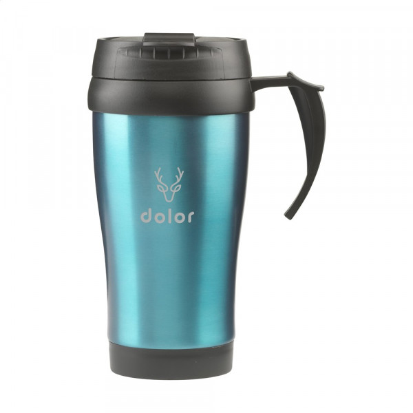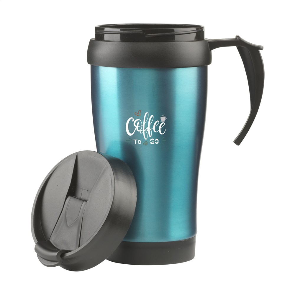 Dubbelwandige RVS/kunststof thermosbeker met schroefdeksel en klikopening. Lekvrij. Inhoud 400 ml. Per stuk in doos.