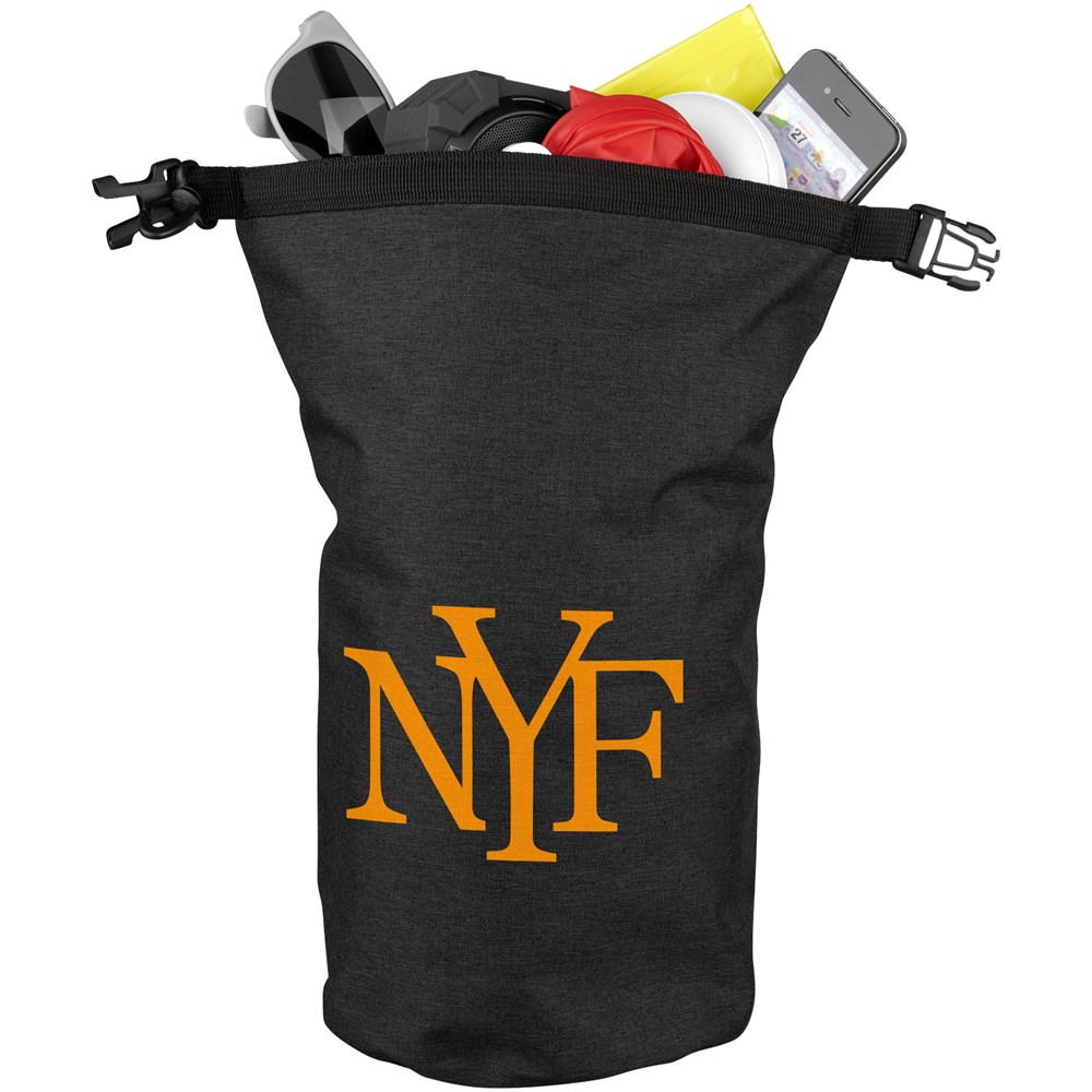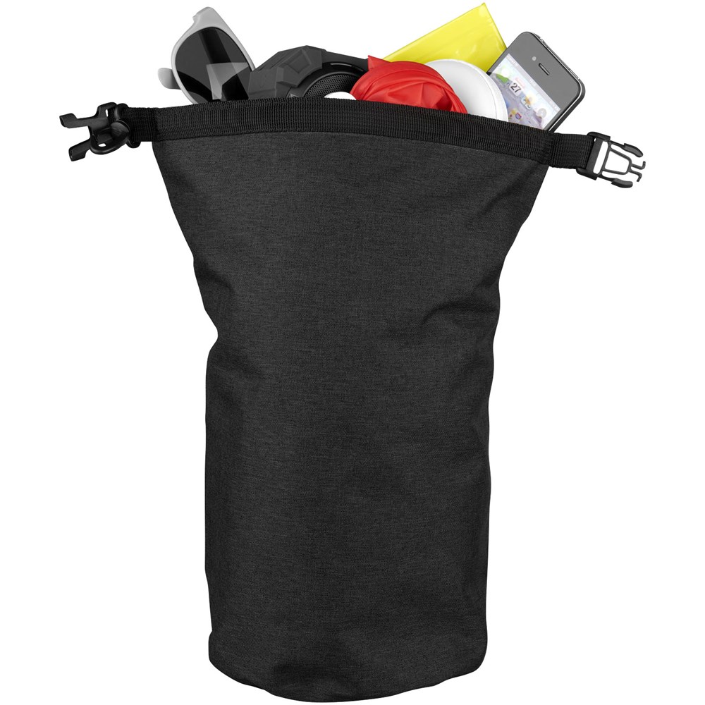 Een waterdichte tas die geweldig is voor buiten. De rolsluiting met plastic gesp zorgt ervoor dat waardevolle spullen droog en veilig worden bewaard. Kan gemakkelijk aan een tas of riem worden bevestigd. Inhoudcapaciteit 5 liter.