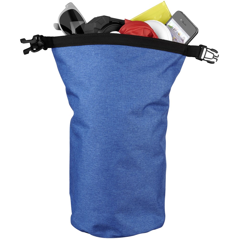 Een waterdichte tas die geweldig is voor buiten. De rolsluiting met plastic gesp zorgt ervoor dat waardevolle spullen droog en veilig worden bewaard. Kan gemakkelijk aan een tas of riem worden bevestigd. Inhoudcapaciteit 5 liter.