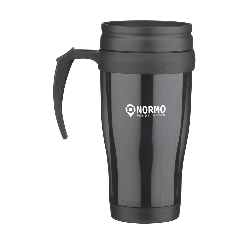 Dubbelwandige, kunststof thermosbeker met schroefdeksel en schuif-/klikopening. Inhoud 400 ml. Per stuk in doos.
