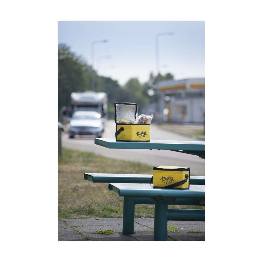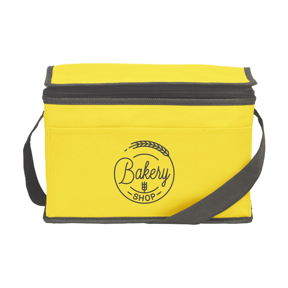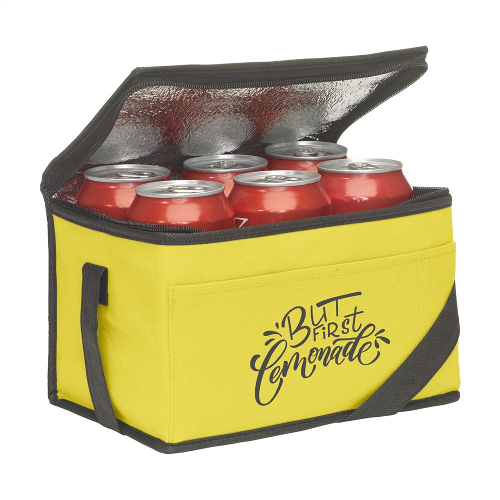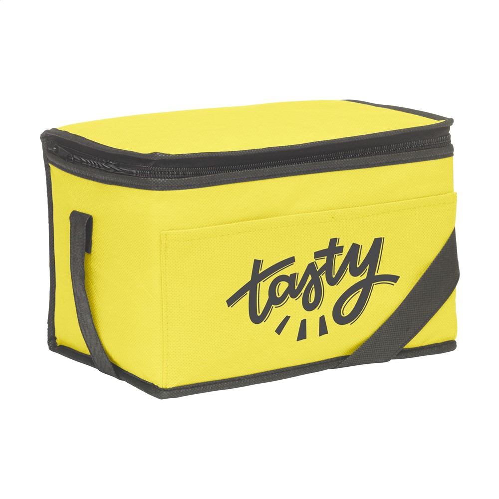 Koeltasje van nonwoven materiaal (80 g/m²) geschikt voor 6 blikjes drank of etenswaren. Met draagriem.