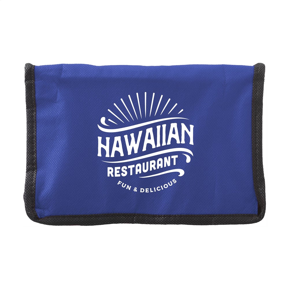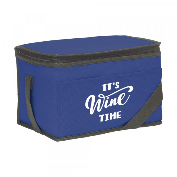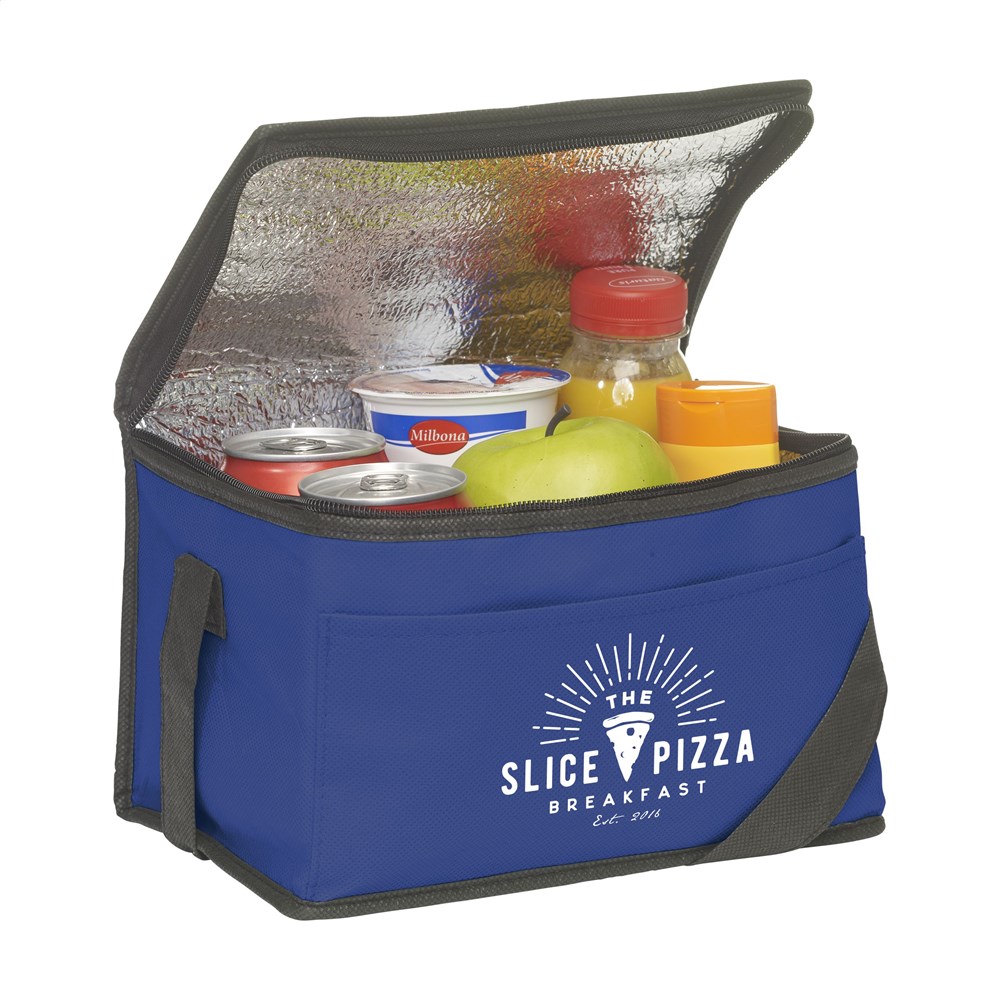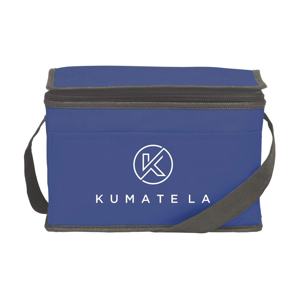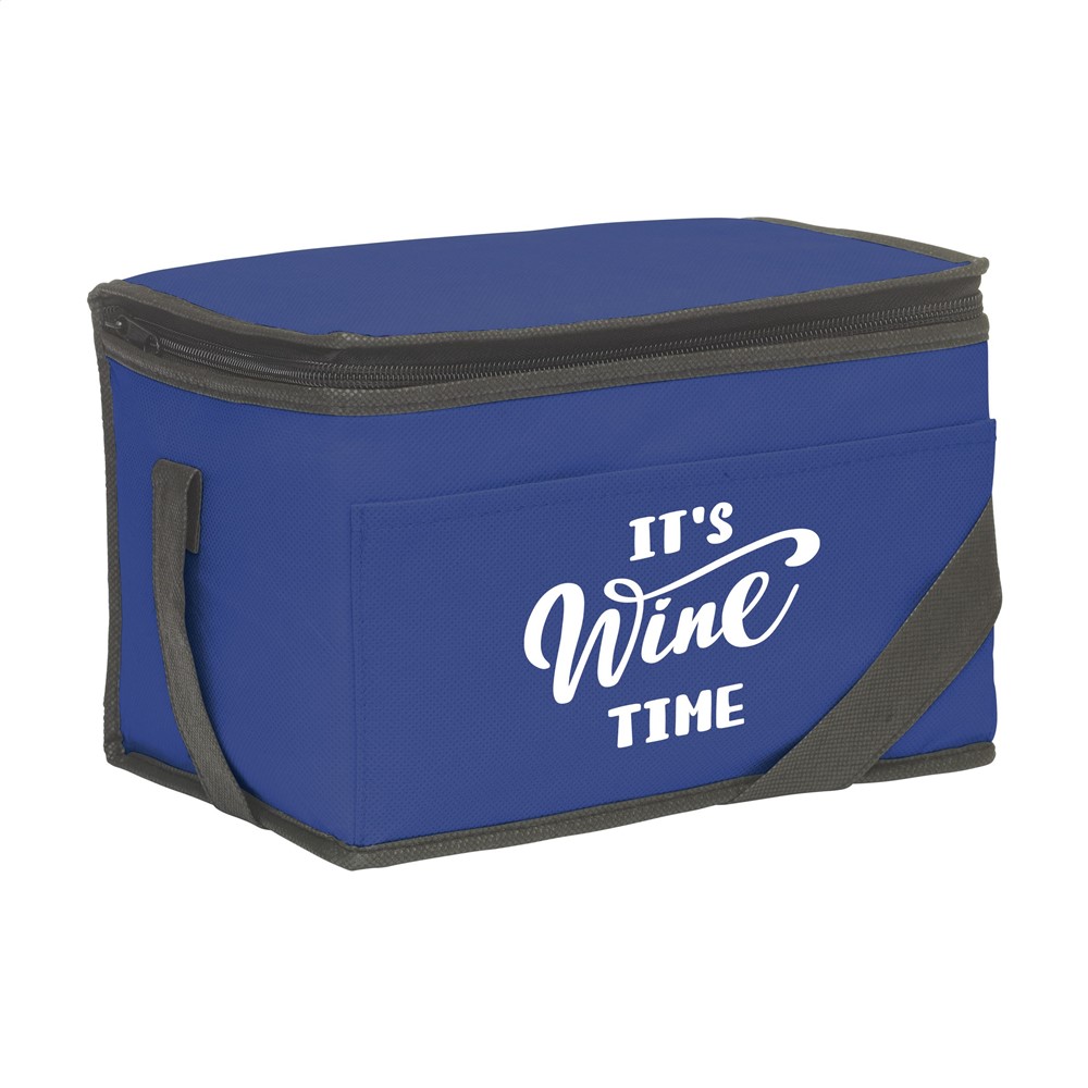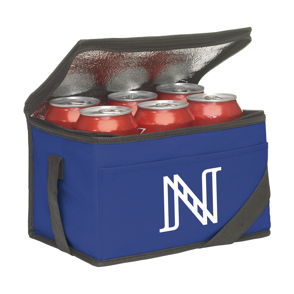 Koeltasje van nonwoven materiaal (80 g/m²) geschikt voor 6 blikjes drank of etenswaren. Met draagriem.