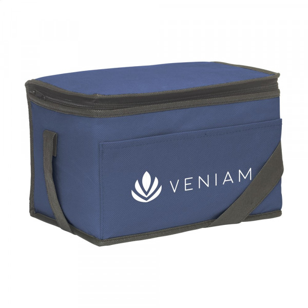 Koeltasje van nonwoven materiaal (80 g/m²) geschikt voor 6 blikjes drank of etenswaren. Met draagriem.