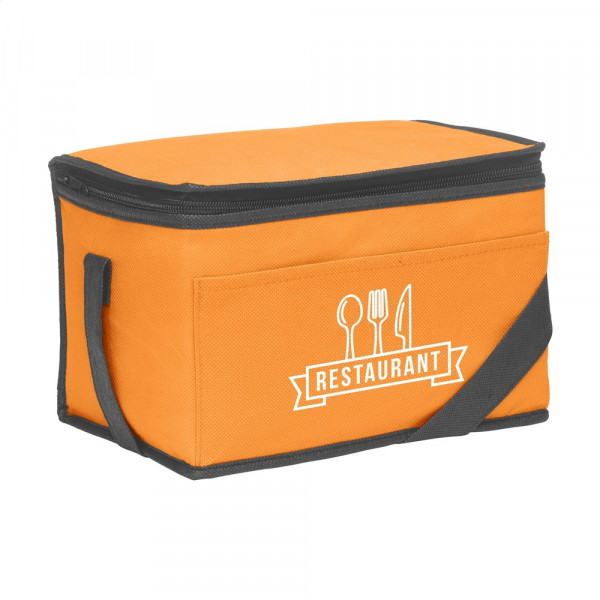 Koeltasje van nonwoven materiaal (80 g/m²) geschikt voor 6 blikjes drank of etenswaren. Met draagriem.