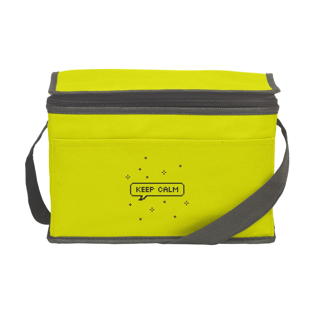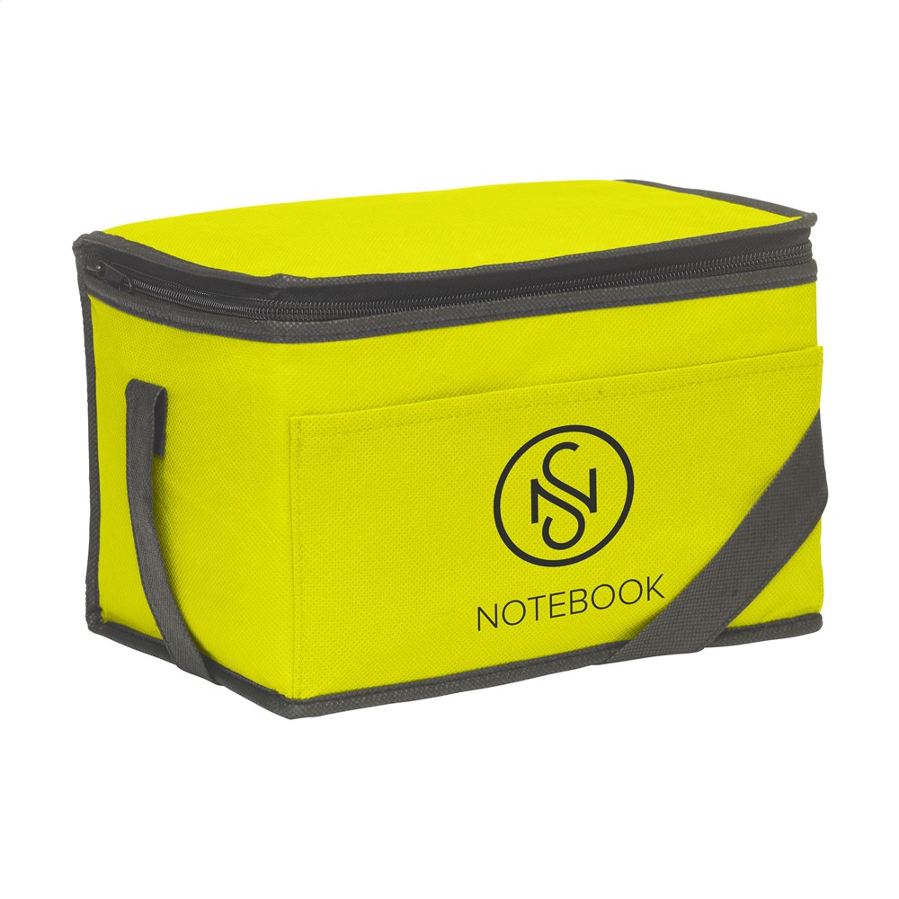 Koeltasje van nonwoven materiaal (80 g/m²) geschikt voor 6 blikjes drank of etenswaren. Met draagriem.
