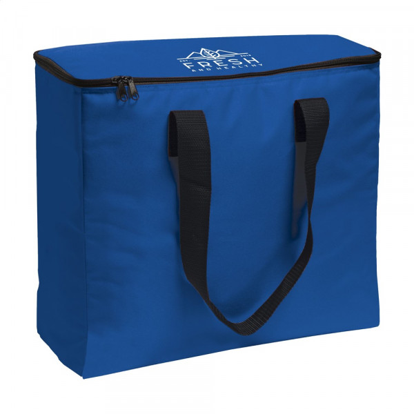Grote, stevige, 600D polyester koeltas met ritssluiting en handgrepen. Enorm veel opbergruimte en geschikt voor flessen tot 2 liter. Op te bergen als compact pakket.