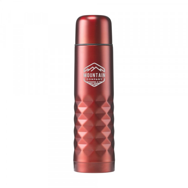 Dubbelwandige RVS thermosfles met schroefdop/drinkbeker en handig schenksysteem met druksluiting. Met opvallend 3D-geometrisch diamantpatroon in de houder. Inhoud 500 ml. Per stuk in doos.