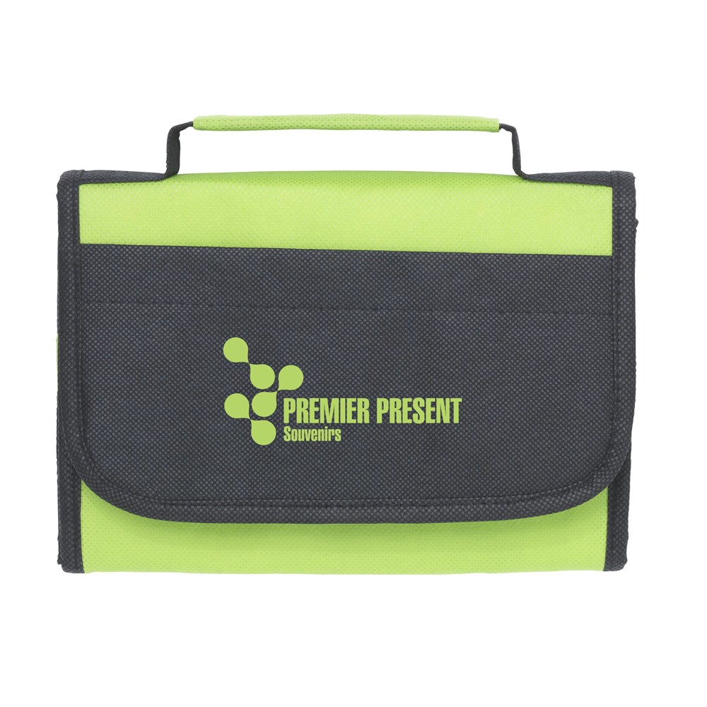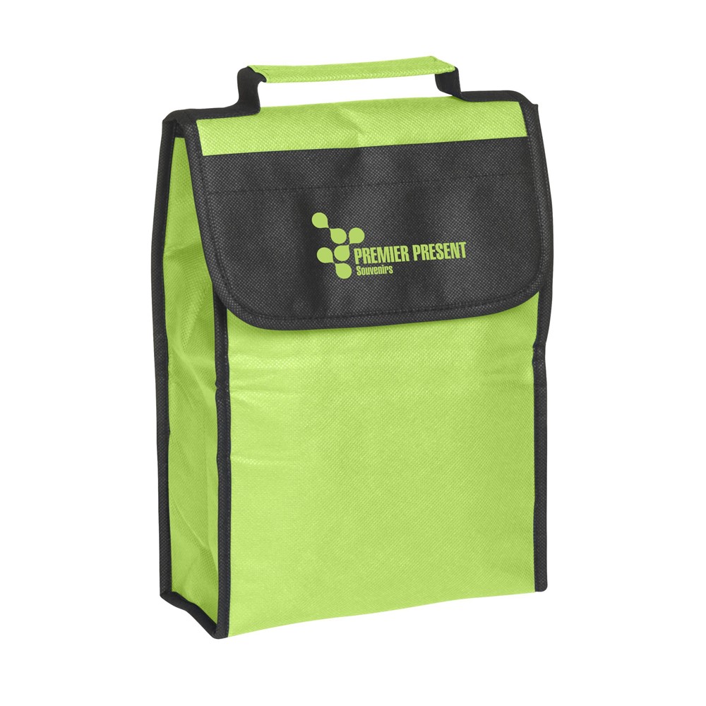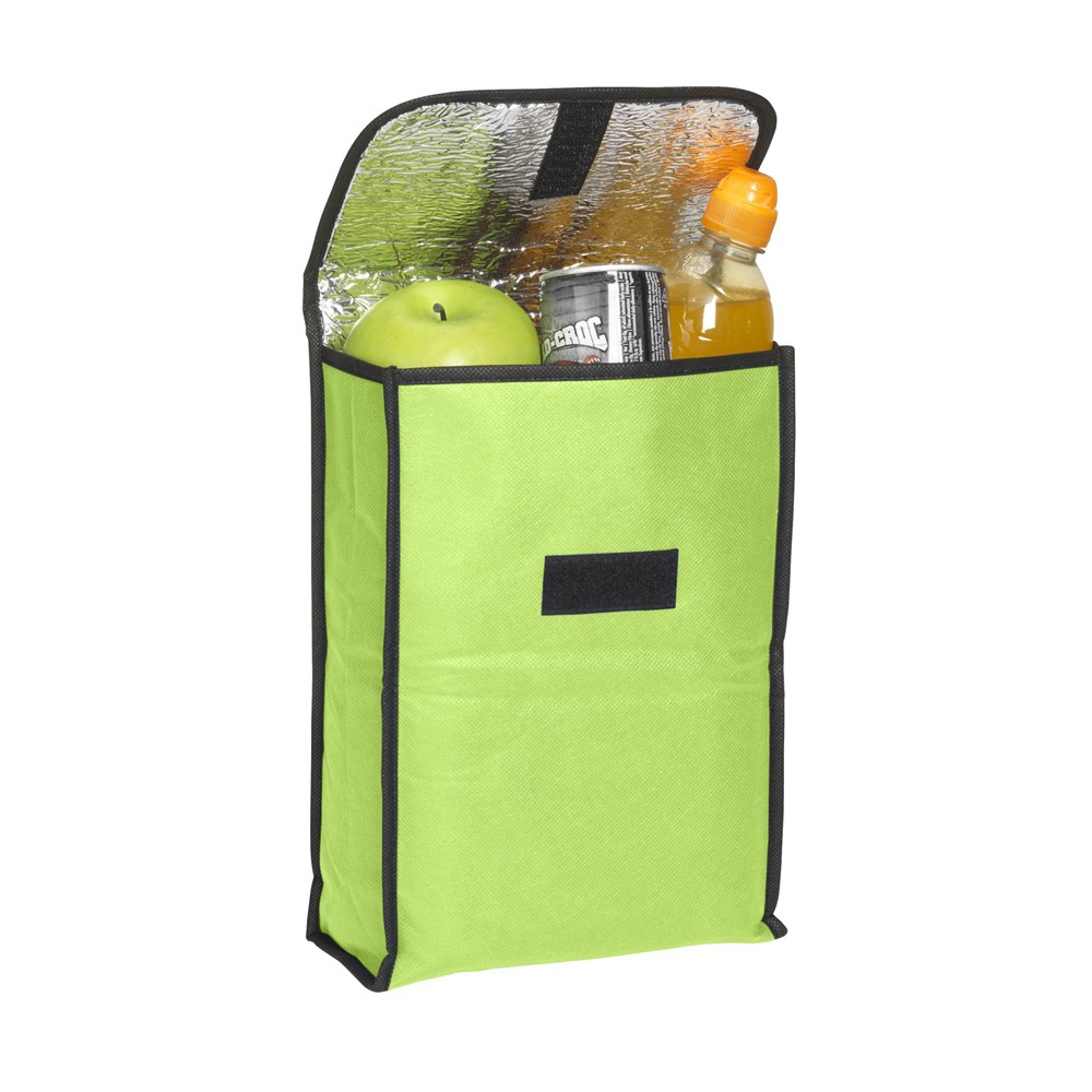 Opvouwbaar koeltasje van nonwoven materiaal. In een compact formaat. Met draaglus en klittenbandsluiting. Afm. opgevouwen 19 x 13 x 2,7 cm.