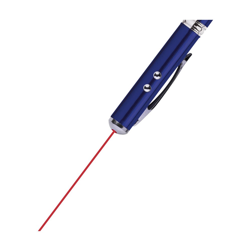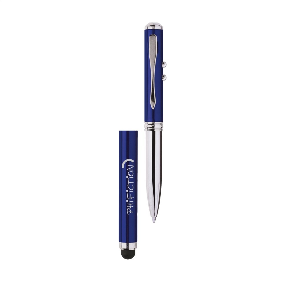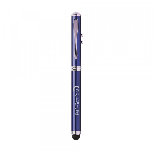 Blauwschrijvende, aluminium balpen met rubberen top/pointer voor het bedienen van touchscreens (zoals iPhone/iPad), geïntegreerde laserpointer, felwit LED-lampje en metalen clip. Incl. celbatterijen. Geef uw geschenk meer karakter met één van onze stijlvolle geschenkverpakkingen.