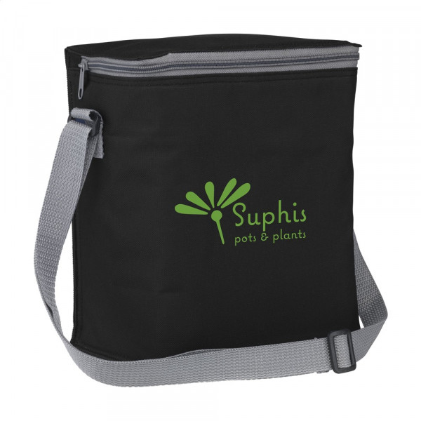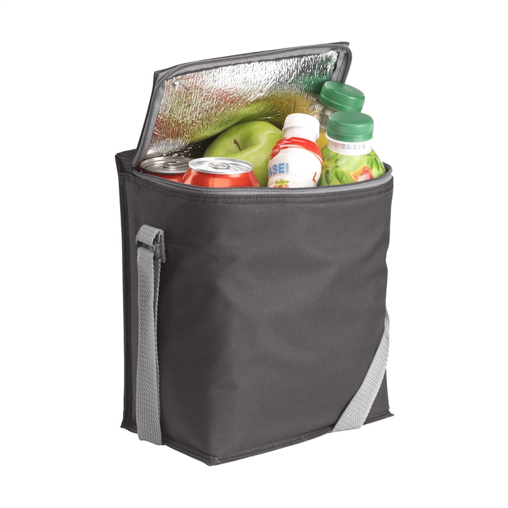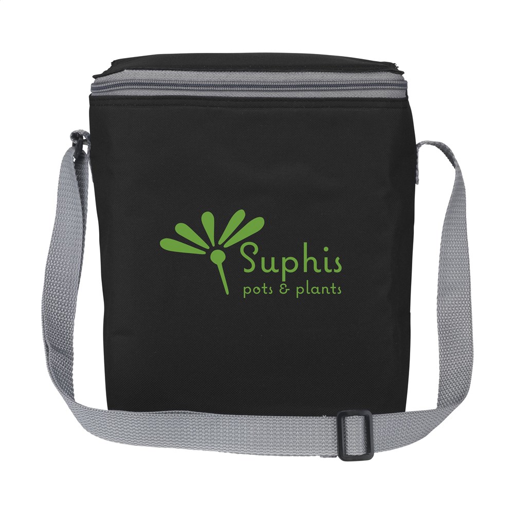 600D polyester koeltas, geschikt voor 6 flesjes drank (inhoud 500 ml) of 12 blikjes. Met draagriem.