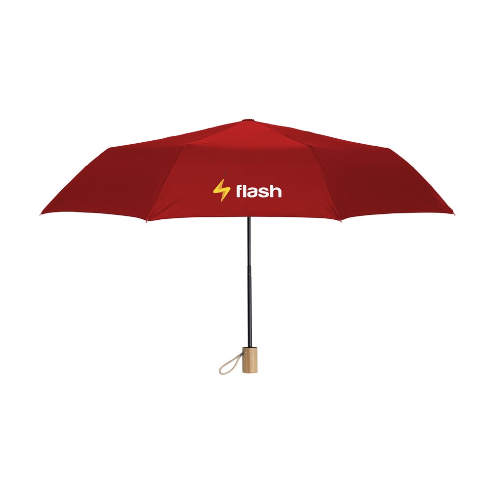 Opvouwbare paraplu van 190T RPET pongee polyester (gerecycled van PET-flessen). Met metalen frame en steel, mooie bamboe handgreep met katoenen lus, klittenbandsluiting, opberghoes en RPET label. Manuele bediening.