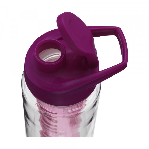Waterfles met infuser. Van helder Tritan kunststof: milieuvriendelijk, BPA-vrij en duurzaam. Met gekleurde, praktische schroefdop en afsluitbare drinkopening. Vul het royale infuser compartiment met vers fruit of groente en creëer je eigen smaaksensatie. Inhoud 700 ml. Per stuk in doos.