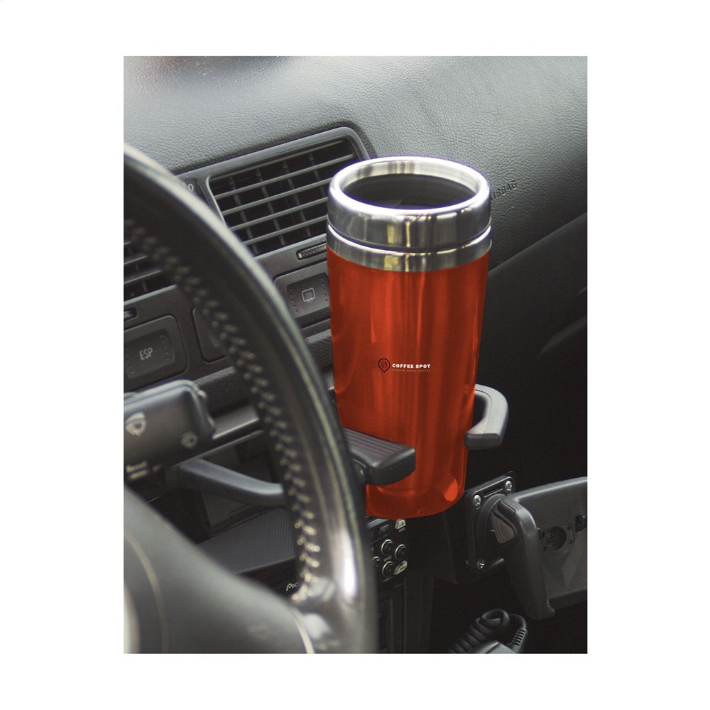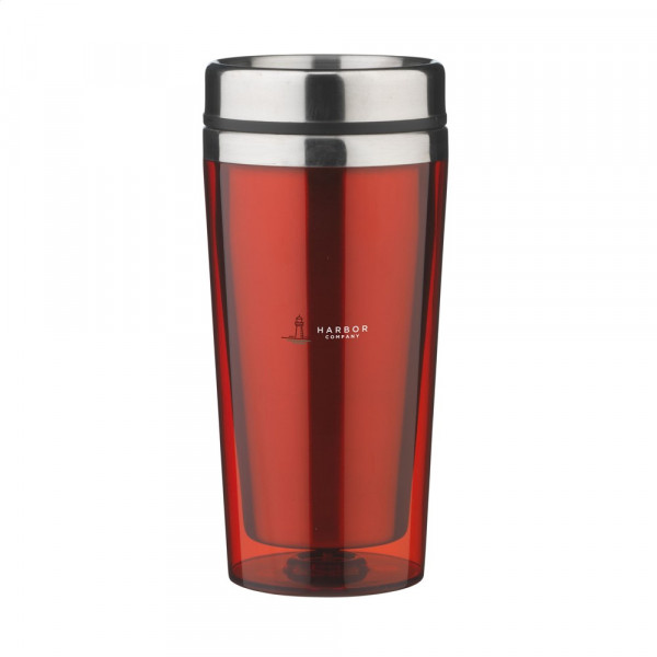 Dubbelwandige thermosbeker met RVS binnenzijde en kunststof buitenzijde, deksel met schuif-/klikopening en slipvaste onderzijde. Inhoud 500 ml. Per stuk in doos.