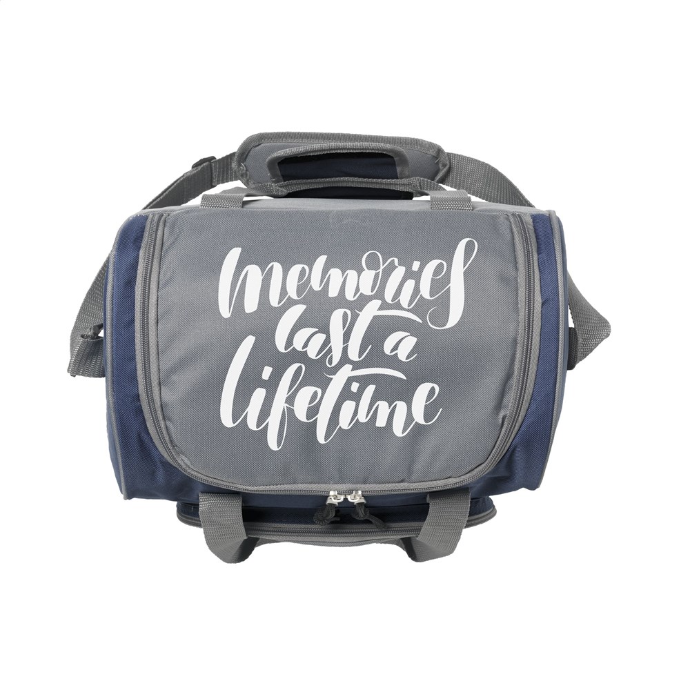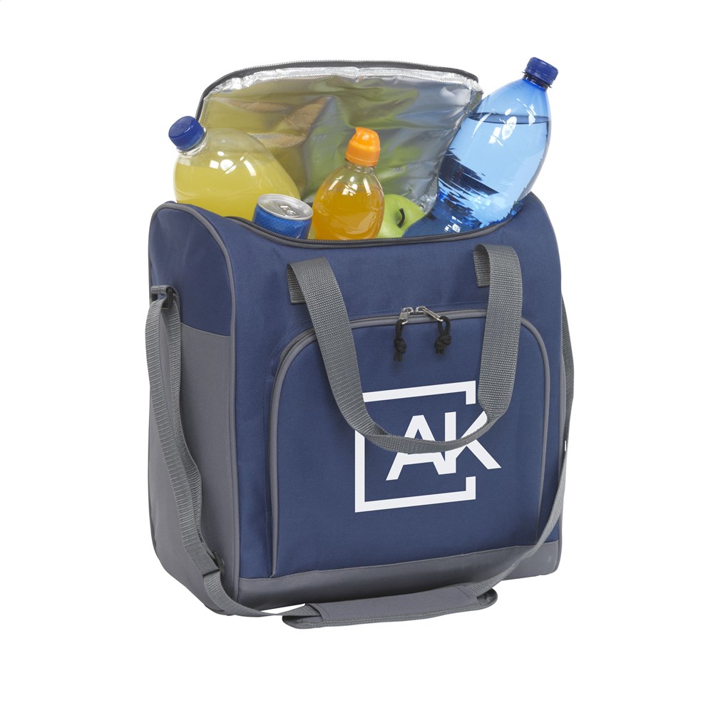 Stevige koeltas van 600D polyester. Met zeer ruim koelvak en ritsvak, verstelbare schouderriem met gewatteerd schouderstuk en 2 handgrepen. Verrassend veel opbergruimte: geschikt voor 6 flessen tot 2 liter.